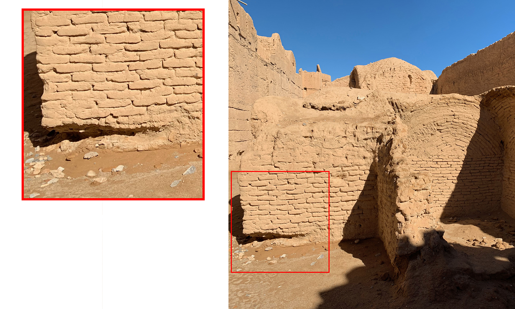 The structural pathologies are deformations which can result from either a singular or a combination of destructive processes, acting in a particular sequence. Exposure and weathering can present challenges in stabilising earthen architecture (Correia et al., 2006, p. 4). Within adobe masses, the expansive action of the moisture and the wet-dry cycles, salt crystallisation, vegetation, cracks, or human-made damage are among the most common destructive factors. Wind erosion is also a concern, while on the site, the wind was often excessive, which causes damage to the outer layer over time if it is not maintained. Saryazd fell into a state of disrepair after it was no longer densely populated, after the 18th century. Maintenance is the best approach to ensuring the durability of earthen architecture. (Baca et al., 2007, p. 62).