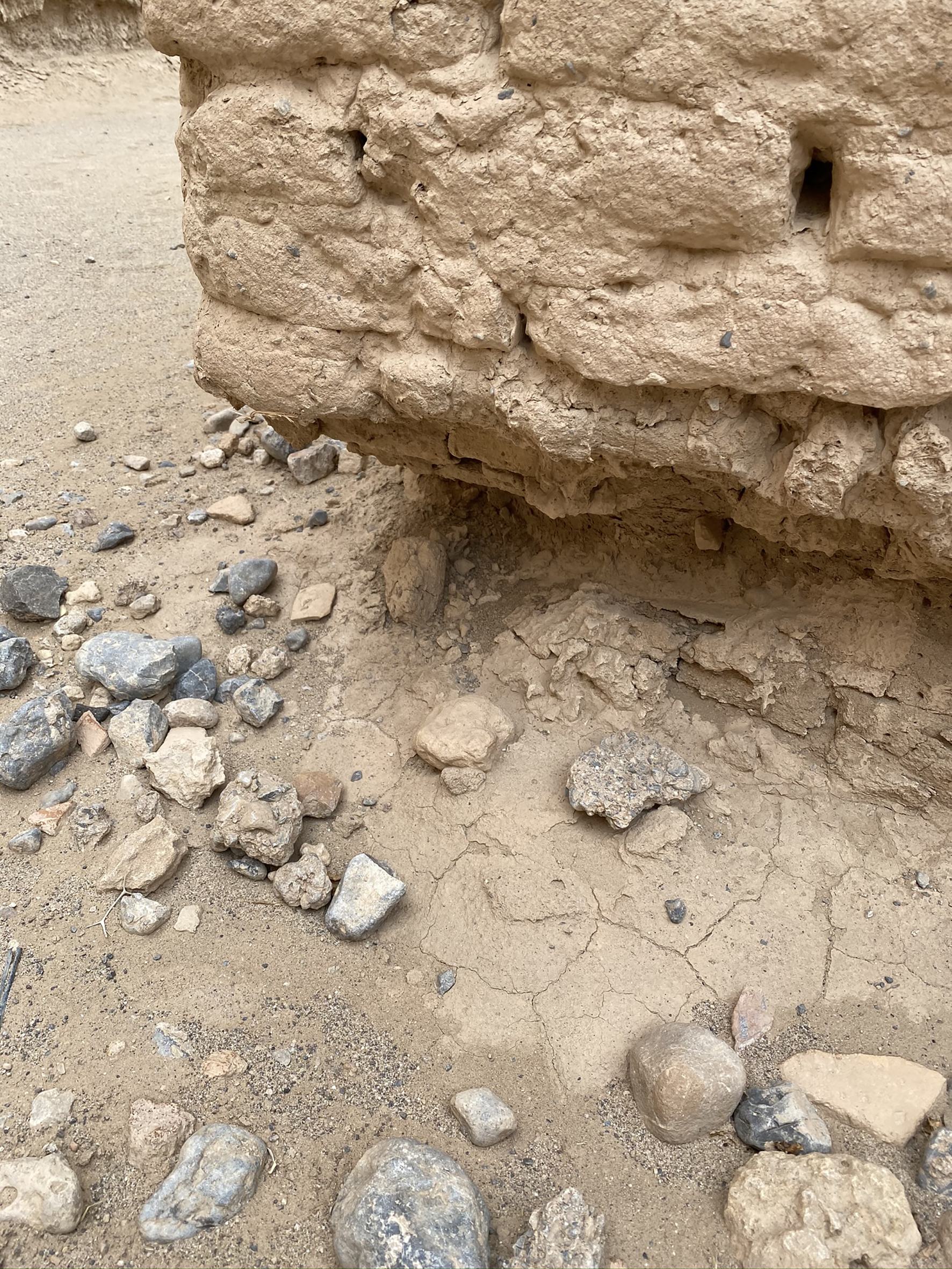 Moisture is not the enemy of mud-brick, and it can withstand a certain amount of water exposure. However, when exposed to excessive moisture can result in a loss of compressive strength, leading to material failure (Crosby, 1987, p. 35). Moisture enables salt to enter the fabric. When heated, both salt and water can expand (Crosby, 1987, p. 36). Mud-brick has a low thermal conduction, that controls the process of heat transfer (Keshtkaran, 2011, p. 431). It is the wet-dry cycles where excessive heat is combined with the expansion of salt crystals and water where failure occurs (Crosby, 1987, p. 38). Cracking within the fabric walls shows evidence of these processes (See Figure 3).