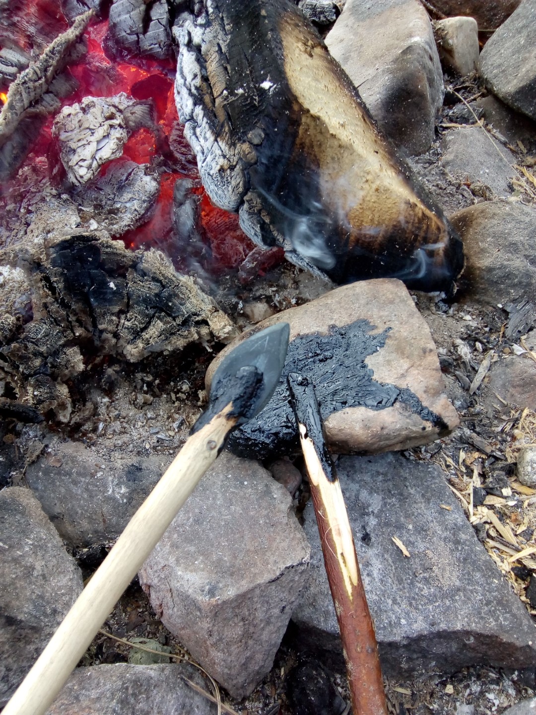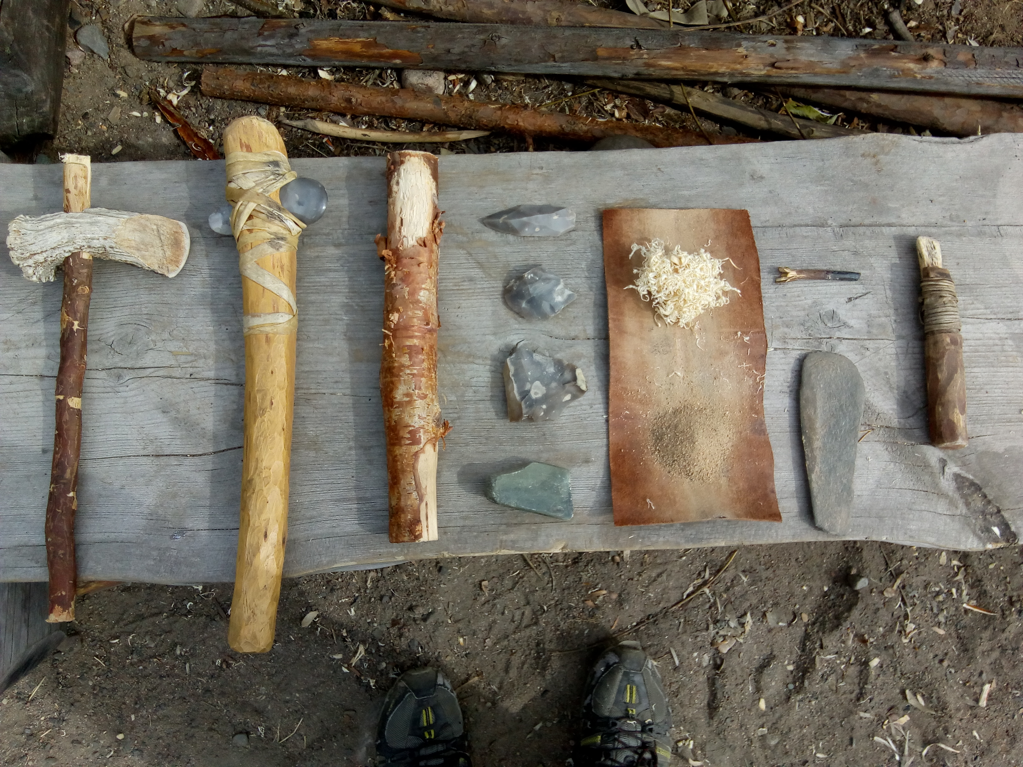 By far the most useful and versatile tool made was a wedge of green slate, chipped and then ground on a large flat granite slab (See Figure 2, 4th from left, bottom). Initially, a miniature polished stone axehead was envisaged. However, after days of grinding the primary bevel, it became clear that it was more important to have a functional tool, than a beautiful polished stone axe. Thus, the secondary bevel was ground and the hafting and polishing abandoned. A slate scraper, roughly equivalent to a drawknife was also ground (See Figure 2, 2nd from right). This proved to be of less use, but was still good for de-barking and removing small amounts of wood.