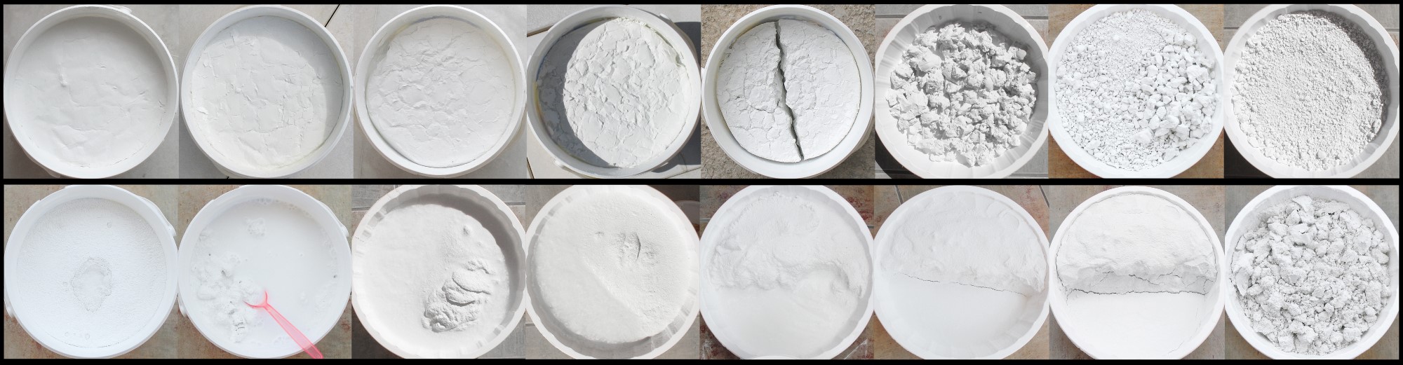 To prepare the dried lime for the samples we took a quantity of that lime and left it in an open container to dry for a month. It was then left in an open container to dry for a month (See Figure 1). When it was half dry it was crumbled to smaller pieces to accelerate its drying. The dry pieces were ground into powder and mixed with water to form a paste. When the paste settled the water was removed and the plaster was left to dry again. The final stage of preparation was to grind the dried lime into pieces of different sizes, from powder to medium sand. The preparation of the dried lime was based on the methods for lime white production described in artist manuals (Cennini, n.d., p.34; Taylor, 1843, p.43; Thomas, 1869, pp.38, 40; Laurie, 1910, p.123; Thompson, 1956, p.97; Seymour, 2003, pp.449, 451).