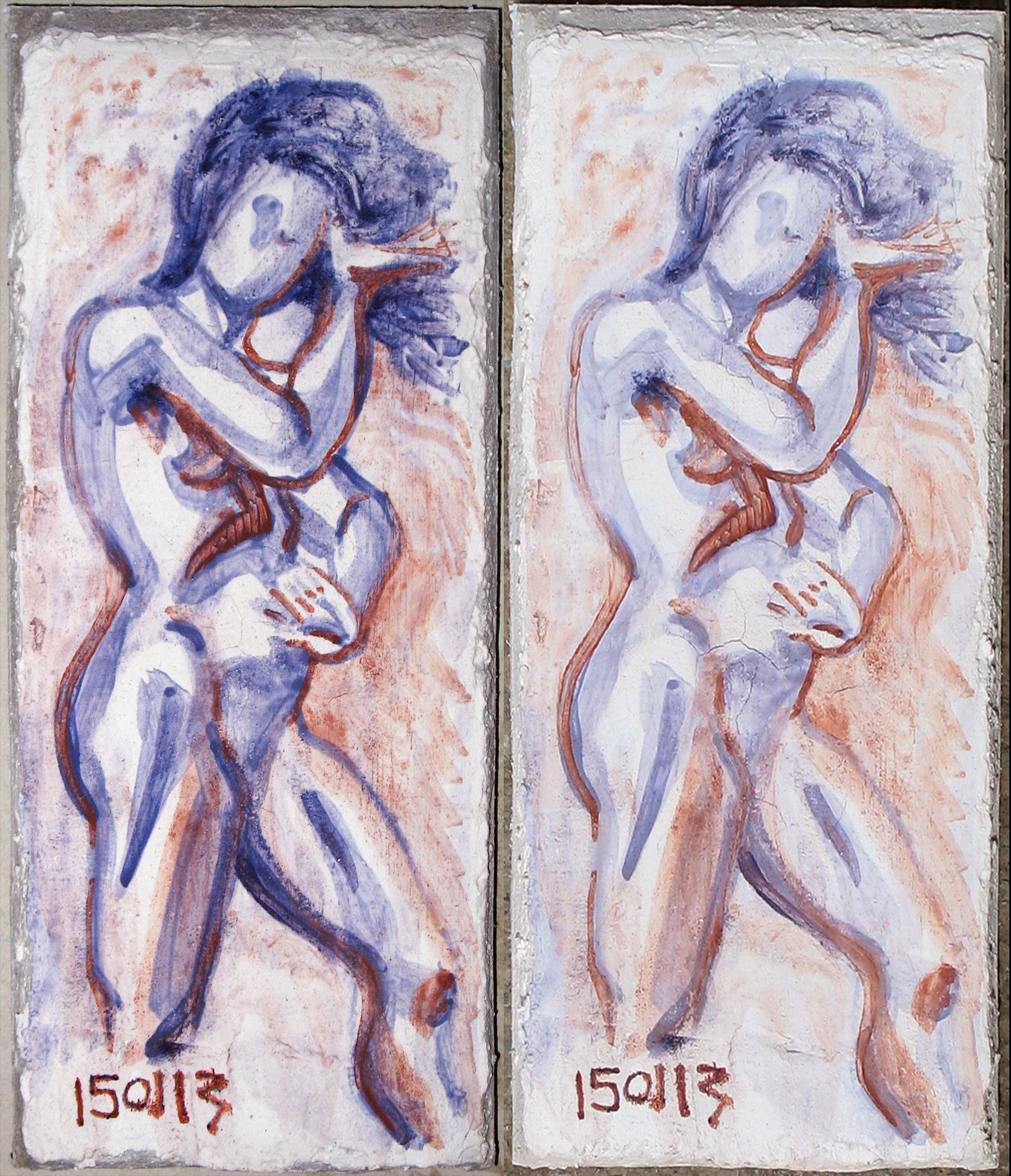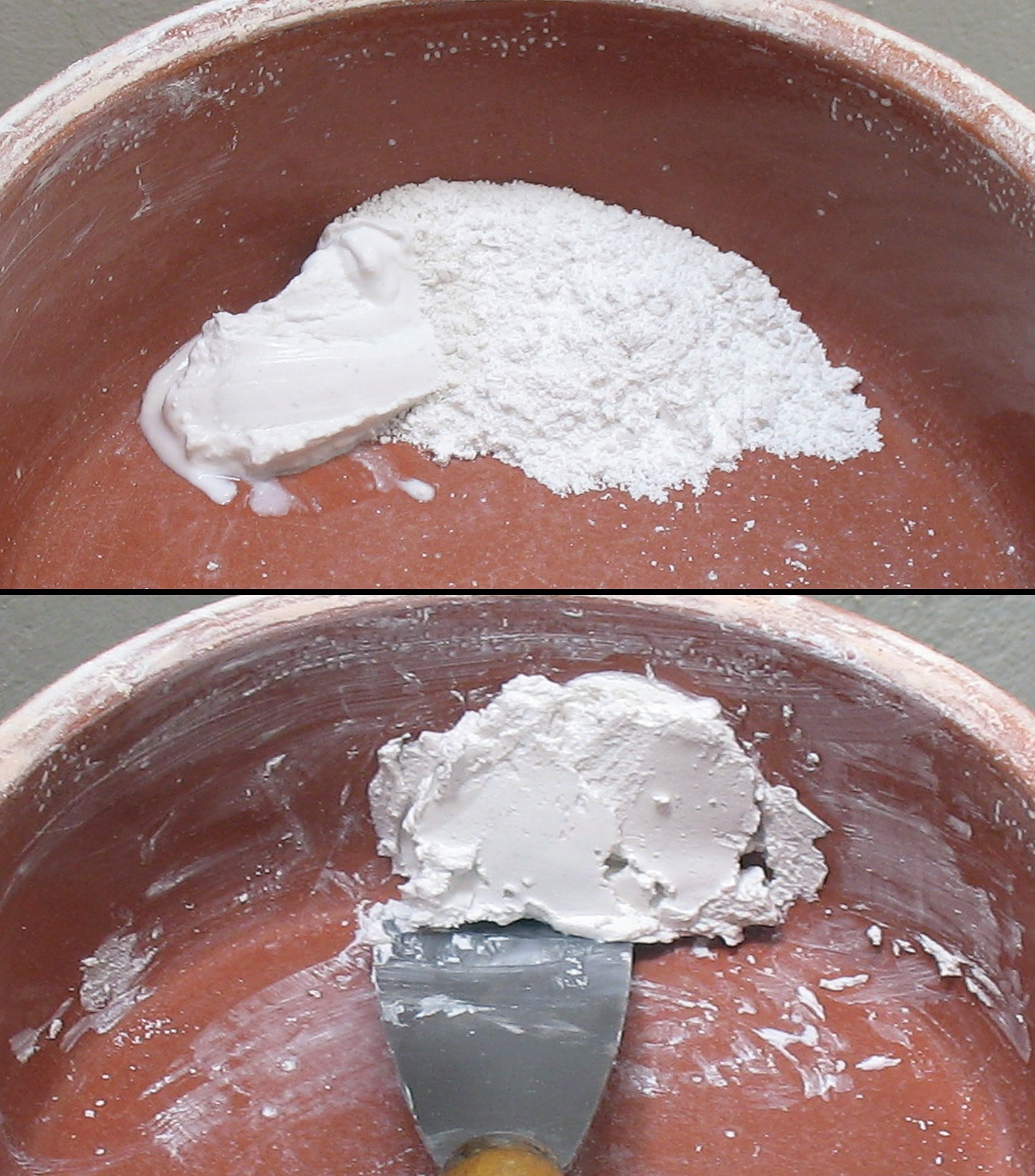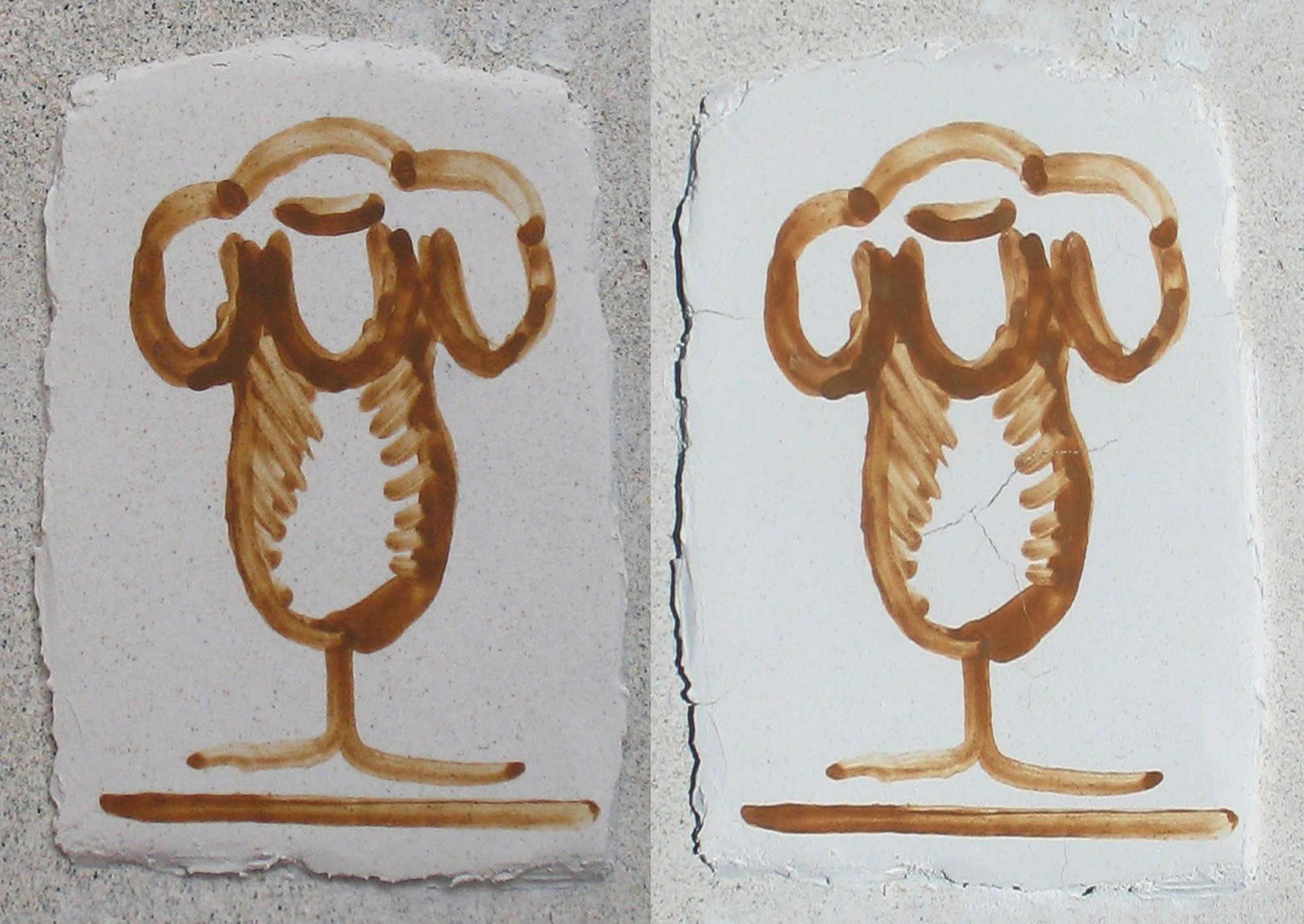 Both of the above techniques can be used to recycle mixtures in order to practice the fresco technique or to practice spreading mortar -as was frequently the case in our research. However, we would not recommend these methods for painting a fresco. The technique cannot be applied to a surface that is larger than a sample without the appearance of cracks and flaking when it dries.