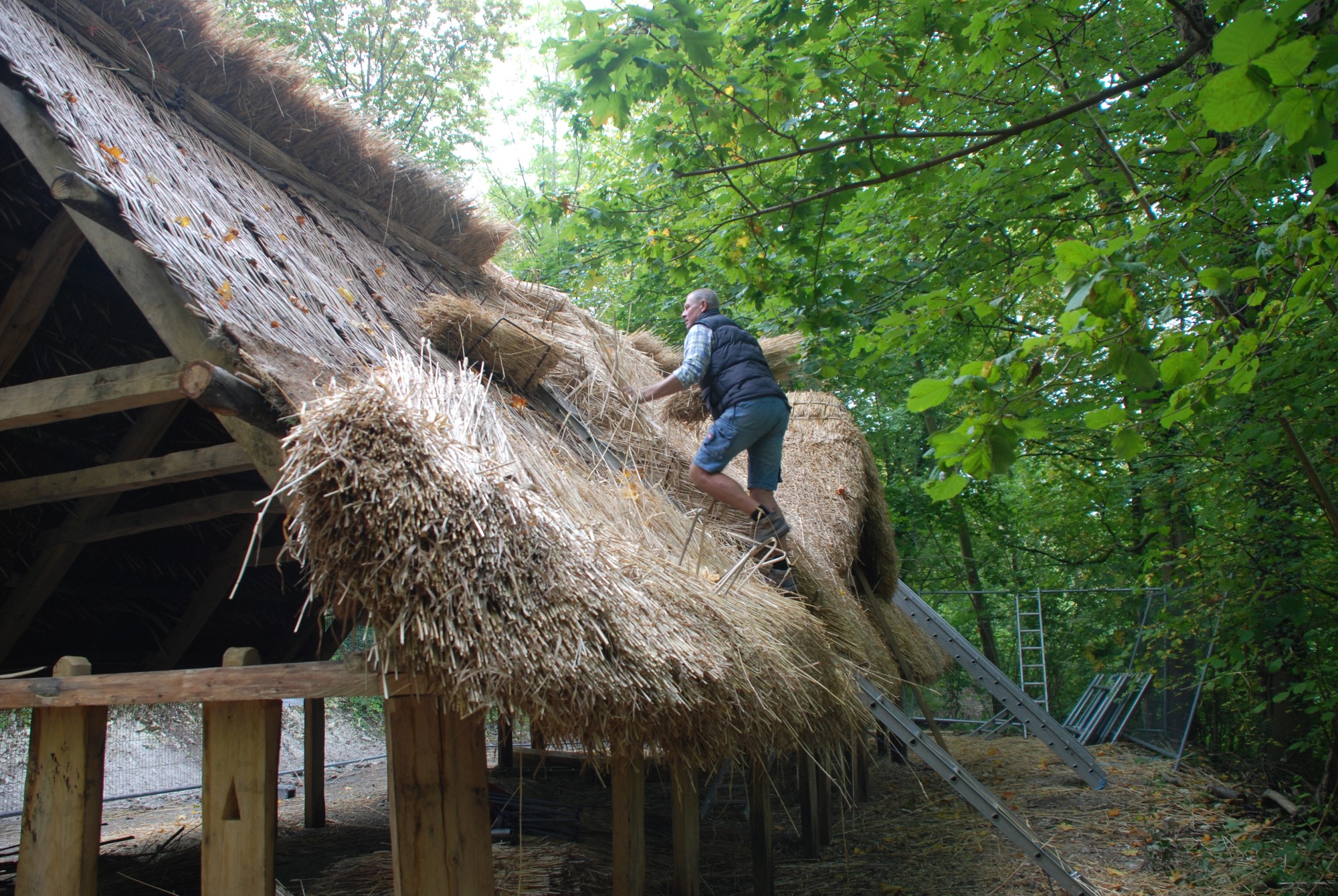 Thatching was undertaken by local Master Thatcher Chris Tomkins, with Andy Pickering and Daryl Mallows, using material grown and threshed in the museum in late September and early October 2015 (see Figure 10). On top of the rafters are hurdles, with a layer of turf under the thatch as found in excavations of water-logged sites from the Thames basin area (Goodburn, 2015). These sites were also the evidence base for the triangular ‘wind eyes’ that are cut into some of the posts (See Figure 11). They were found in Uxbridge and date to c.800AD to 900AD. It is thought that the word window could be a corruption of ‘wind eye’ and they do let in some light and air to the structure but symbolism beyond that is open to debate. Another feature that was clearly recorded in the excavation report by archaeologist Mark Gardiner (1993) is the two posts align at a 45˚ angle to the others.