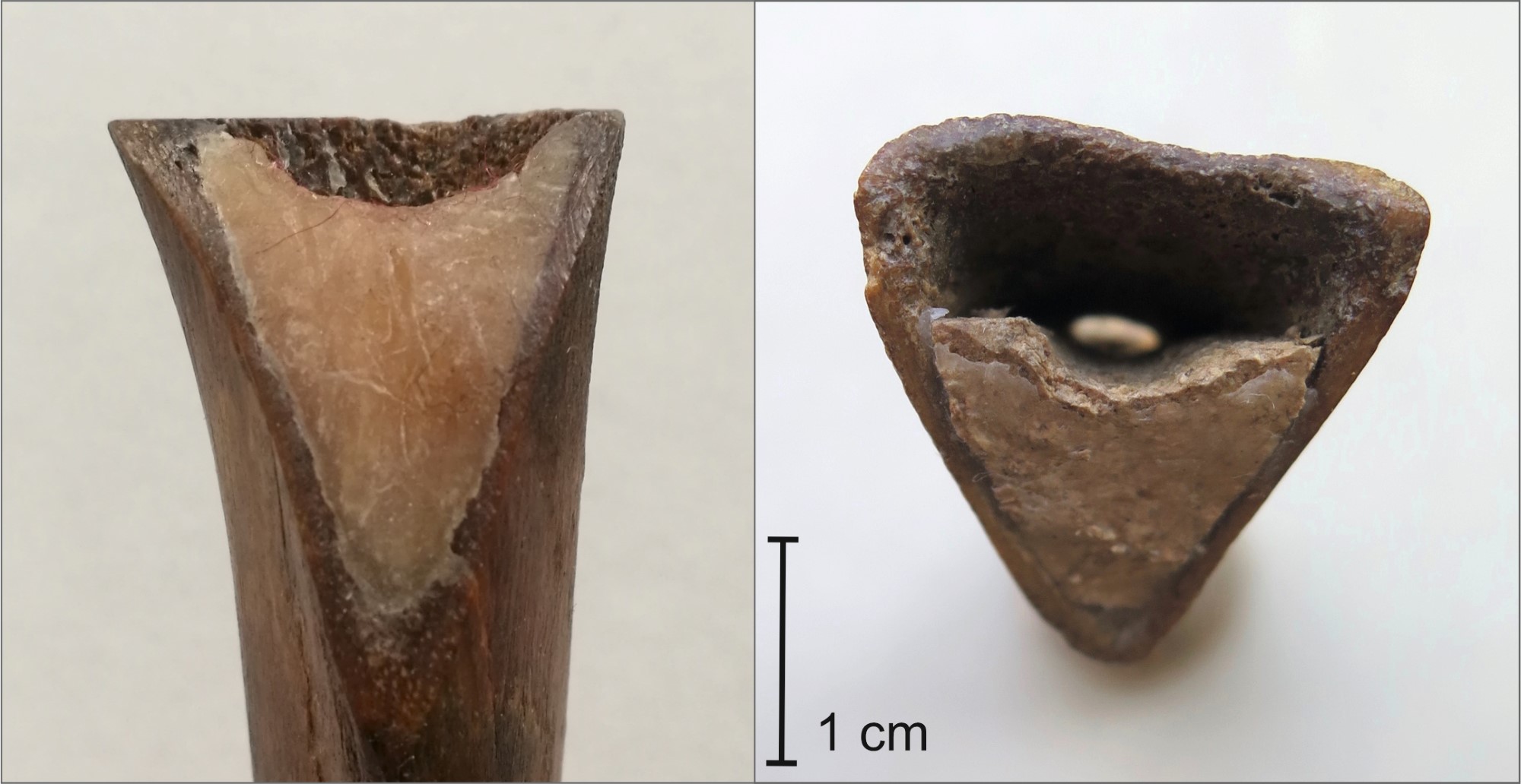 A sheep tibia is pre-eminently suited to turn into a block-and-duct duct flute because its upper end is widening. When the ends of the bone are opened up, and the marrow is removed, possibly by cooking in a broth, a tube with a wide, conical end will result. In the Mätäjärvi bone, the outer diameter of this wide end is 19 x 20 mm, while the inner diameter is 15 x 16 mm (See Figure 4a). The conical cavity at the wide end influences the displacement of air when the tube is blown: blowing the wider end produces a sound that is lower than in a cylindrical tube of the same length and cavity volume. In addition, the conicity gives way to the flute’s mouthpiece constructions: the block and windway. For making another type of wind instrument, such as reed pipe, other types of bone are better suited. An example of this is a sheep metatarsus excavated in Turku with a more or less cylindrical narrow bore that we reconstructed with a vegetable reed (Rainio and Tamboer, 2017; Tamboer and Rainio, 2020). The upper end of a sheep tibia is too wide to accommodate a reed. If desired, a reed can be inserted in the lower narrow end that in the Mätäjärvi bone measures 9 x 10 mm (outer diameter) or 4 x 5 mm (inner diameter) (See Figure 4b). However, the interpretation of the Mätäjärvi artefact as a reed pipe seems implausible. If the wide end of this bone was meant to be the bell – the flared outer end – of a reed pipe, it would have been cut across at a straight angle, not at an oblique angle. An oblique, slanting beak is typical for many, if not all, mouthpieces of bone duct flutes. Its purpose is to facilitate blowing. Therefore, this feature typifies the Mätäjärvi artefact as a duct flute.