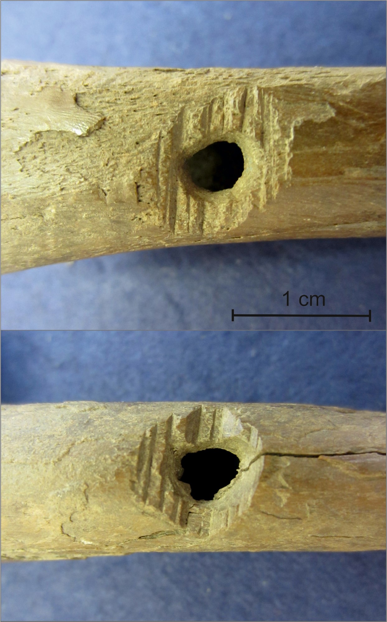 The flat backside of the Mätäjärvi tibia has been turned into the front side of the flute by adding holes. Two human-made holes are clearly visible (See Figure 6); of a third hole, only the top rim is left. As the lower part of the tube is lacking, we do not know whether the artefact was originally provided with a fourth hole. The diameter of the more or less round holes is 4 x 4 and 4 x 3.5 mm. Transverse scratches around the two holes and the deep cut at the damaged hole make clear how the maker proceeded in perforating. At first, the maker thinned the places of the intended holes by cutting, or rather chopping them with a knife. This makes it easier to drill a hole through the thick wall of the bone. Furthermore, the resulting concave surfaces make it easier for the fingers to find and close off the holes when playing. This is a feature found in several medieval bone flutes (Leaf, 2008). Drilling of the holes in the Mätäjärvi tibia was probably executed by scraping with a knife and by turning the point of the knife round and round. This can be deduced from the fact that the holes are not quite as circular as when executed by a drill. The ridges around the holes were not finished off. Perhaps the strategy was to scrape off all cutting traces in the end if the instrument appeared to play satisfactorily. Was the maker of the Mätäjärvi flute dissatisfied with the result, leaving the rims of the holes unfinished or discarding the artefact after it broke? Or was the maker just sloppy? All in all, this flute is rough-hewn and coarsely made compared to other bone flutes of the same type, excavated in Great Britain, the Netherlands, or elsewhere in Central Europe (See Figure 7).