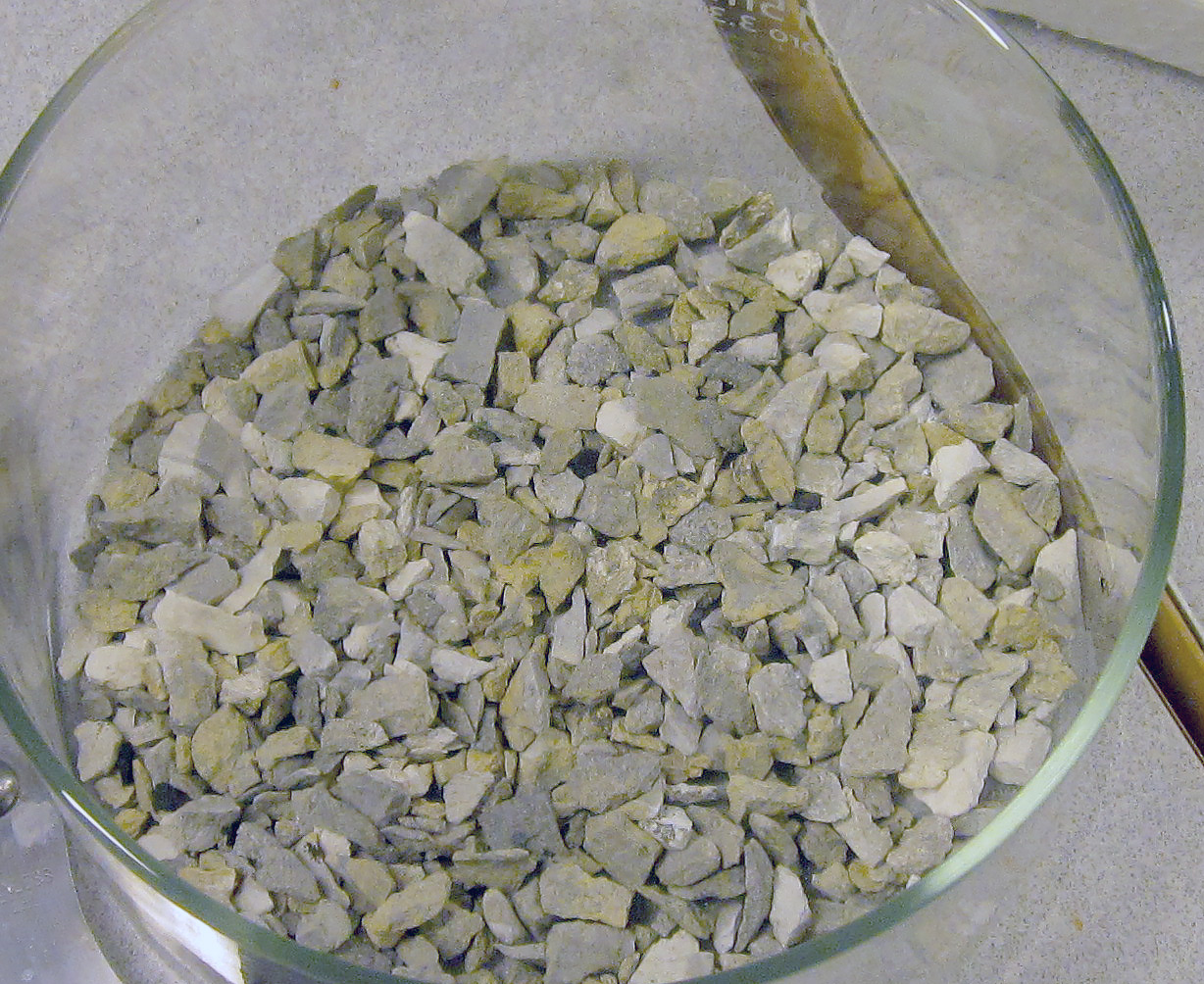 Lime burning in Neolithic pit-kilns was experimentally modelled by using a vertical tubular reactor of stainless steel with an inner diameter of 2.5 cm placed in a tubular electric furnace with a heated length of 60 cm. The samples were placed in separated layers on a fine metallic grid. The facility is a reasonable representation of a kiln as it allows the thermal treatment of materials at controlled temperatures and a gaseous atmosphere. The experimental facility is illustrated in Figure 4. Figures 5-7 show the crushed raw materials utilised for the experiments: Figure 5 shows limestone, Figure 6 shows carbonaceous fuel, and Figure 7 shows malachite.