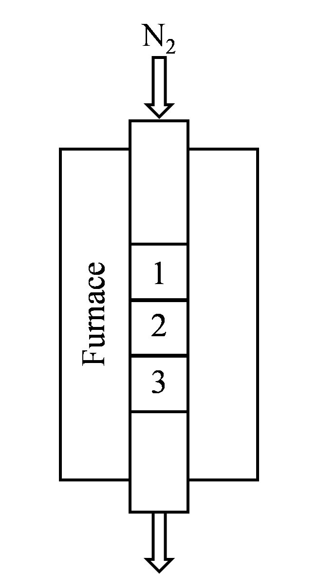 Three different materials were used for the malachite transformation: limestone, solid carbon fuel and malachite. The malachite used had a copper content of 57.7%. All materials were prepared and sieved to a particle size of 3-5 mm. In each experiment, the furnace was loaded with 45 g of limestone (position 1), 10 g of charcoal (position 2), and 9.5 g of malachite (position 3). The samples used in the experiment were pre-dried at 105Âş C in a drying chamber. After loading the steel pipe in the furnace, it was heated to the final temperatures: 800 and 850Âş C, followed by heat treatment at constant temperature for 2 hours. Thereafter, the furnace was allowed to cool in room temperature surrounding until reaching 40Âş C. The same experimental procedure was applied for both temperatures. A nitrogen gas flow rate of 25 ml/min was applied during the time of the experiments in order to transport the formed CO2 from limestone and malachite through the beds of charcoal and malachite in order to simulate the gas circulation from ventilation in the pit kiln. The experiments were designed in order to expose malachite to a reducing CO atmosphere formed when CO2 from limestone reacted with solid carbon in the charcoal according to the Boudouard reaction:
