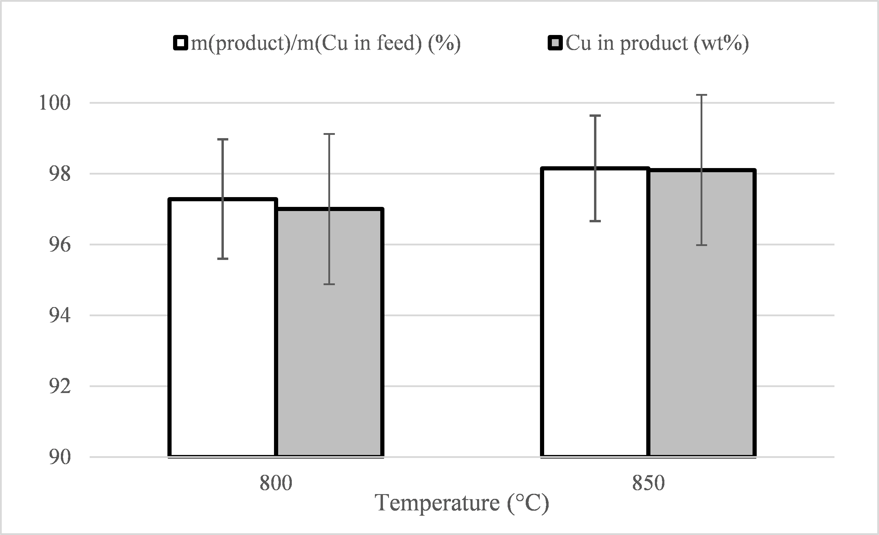 Figure 9 presents the results of the malachite conversion into copper and is presented as the weight of solid product over the copper content in malachite (in white) as well as the Cu content in the solid product (in grey, wt %). Absolute numbers of results are presented in Table 2.