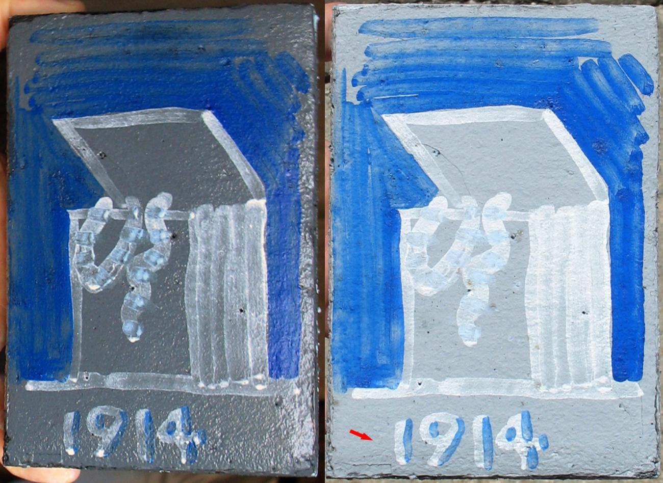 Both the mortar and the colours became matte when they dried. The mortar took on a medium tone of grey that had a blueish hue (See Figure 24). It had become quite light in weight. It was heavier than that of 15513 Ash, but lighter than a mixture of lime with thin sand. The holes from the pierced bubbles were still visible. We observed only one small crack in front of the date of the sample (See Figure 25). The mortar generally worked well. The proportion of lime and charcoal also appeared to be correct. We believe, however, that charcoal should not be the only aggregate in the mixture. It would be more appropriate and more durable if the mixture contained some sand. A mixture such as that of the base mixture of sample 14613-13913 Ash is more appropriate because the dominant aggregate is sand, and charcoal is only an additive in a small amount.
