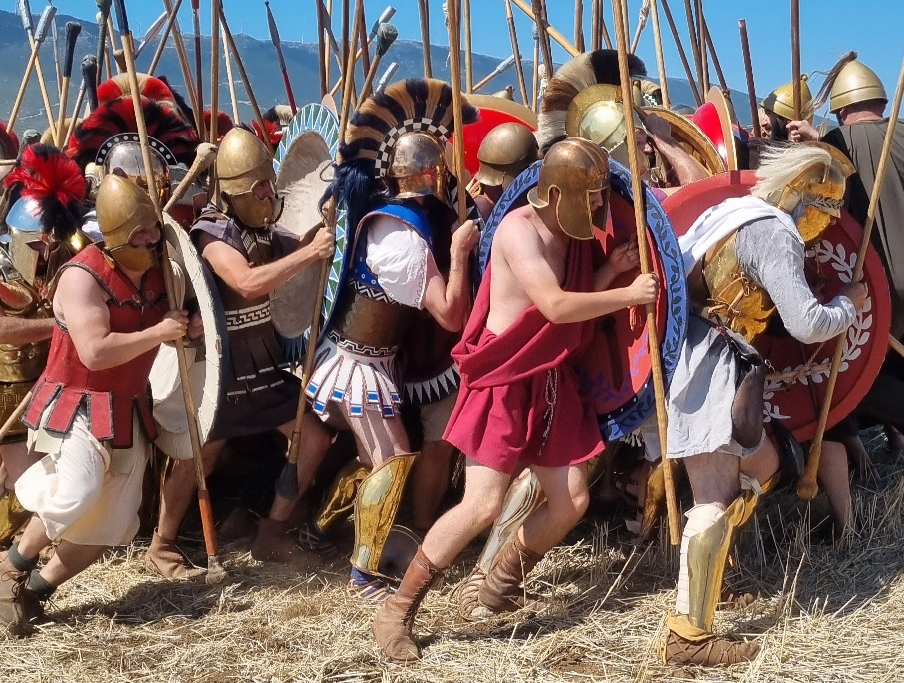 Delayed by the pandemic, the 2022 event was organised with the support of the local community, the Ephorate of Antiquities, and the re-enactment group ‘Hoplologia’ lead by Christian Cameron. Using re-enactors to commemorate their Classical history was, for a variety of political and religious reasons, an important step for the Greek authorities to take. Christian gathered around ninety very experienced and passionate re-enactors and reconstructors in Plataea from at least eight different counties, at their own expense. The majority chose to portray hoplites, the close order heavy infantry who perhaps a little fortuitously won the land battles of the Persian wars. Hoplites came to represent and dominate Greek warfare, until given a rude awakening by the combined use of cavalry, light and heavy infantry during the Peloponnesian Wars (See Figure 1)