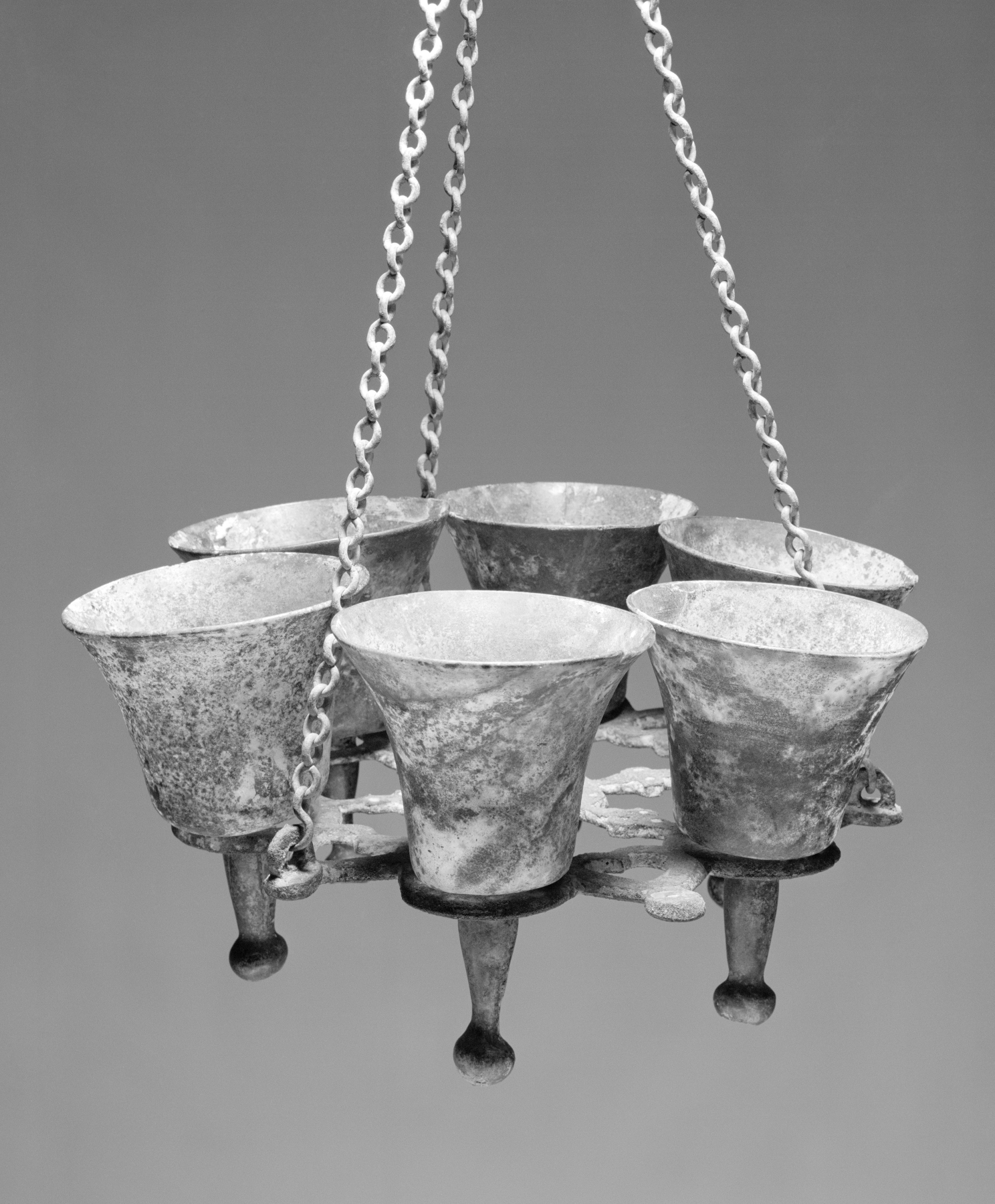 In illuminations, you see the lamps hanging down from the ceiling, and often you can also see that they are held up by chains. Many types of chain links have been found from the Viking Age and the early Middle Ages. Among other finds examples include: from Viborg Søndersø, Denmark, an iron chain of thinly wound iron wire, a similar chain has also been found at Møllestrømmen near Haderslev, Denmark. It is with this technique I chose to make my suspensions. This proved to be quite an effective suspension and the heat from the flame did not affect the suspension in any way.
