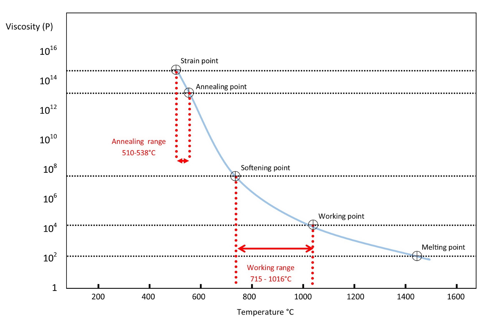 Viscosity is shown on the vertical axis in Poise and is a logarithmic scale to express the enormous viscosity changes which occur. Temperature is shown on the horizontal axis in degrees centigrade. The black dotted lines correspond to specific âfixed pointsâ used to describe specific points in viscous behaviour but do not correspond to a step change in behaviour such as occurs for example, when ice becomes water.