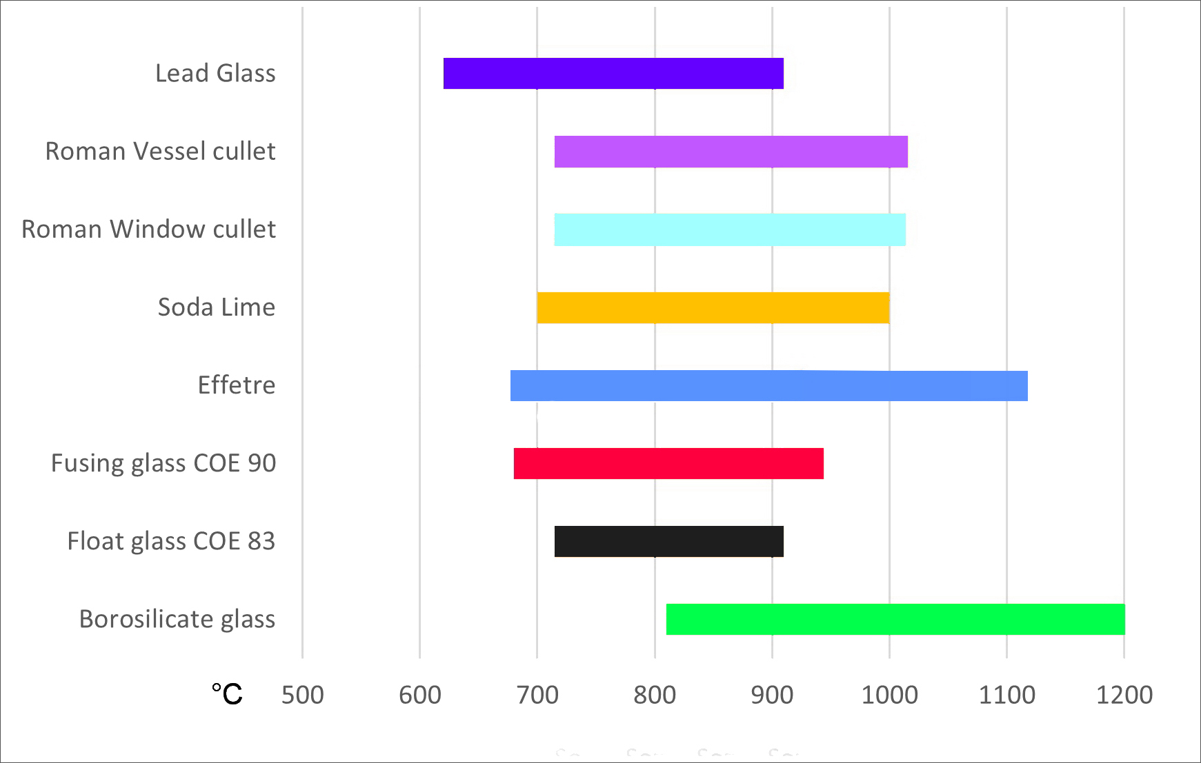 Table 3. Viscosity of Selected Glasses. The figures in Table 3 are guides only and are found to vary slightly depending on the source. The grey shaded area indicates the âWorking Rangeâ of the glass or the range of temperatures between which the glass is workable for beadmaking or glass blowing.