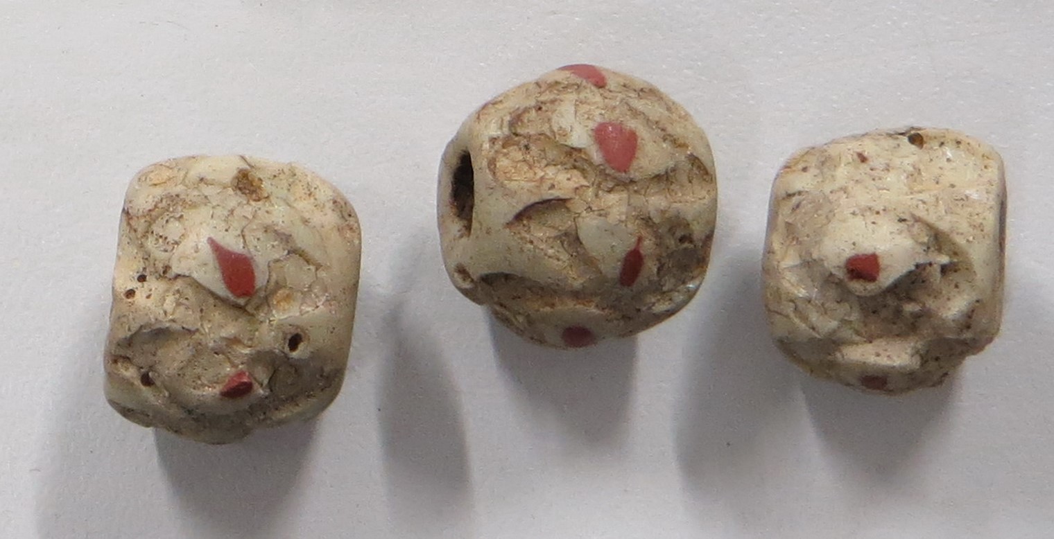 An example of this is seen in a group of Early medieval beads found in several sites across Eastern England (See Figure 6). The white beads were decorated with translucent blue trails and red dots, but because the blue and white glasses are of different COE, the blue trails have dropped out. The red dots remain, which suggests that there was compatibility between the white and red. Calculations from the XRF analysis of the white glass show a COE of up to 106 â indicating a very soft glass which would contract a lot on cooling. The red and blue glass was unfortunately not analysed in the study.