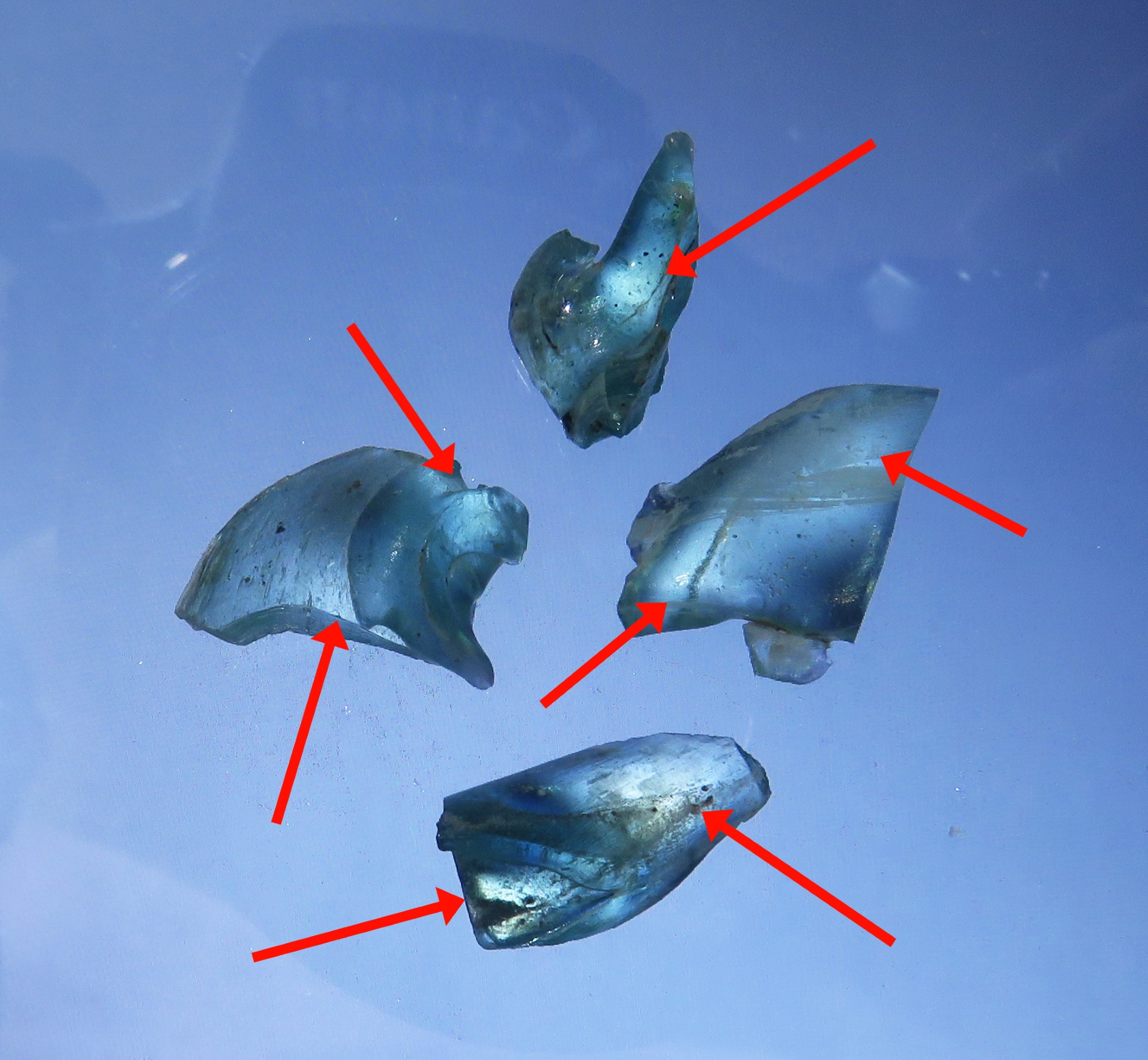 How much was known in antiquity about this is hard to assess, and practical tests for stress in Roman glass for this study have shown stress in the glass cullet (See Test 2 below). Nonetheless, glassworkers must have been aware of the problem when the glass shattered more easily on cooling and fractures appeared where handles joined vessels or bead trails and dots fell out. They would also have been sensitive to the working properties; if a glass is too soft, it is difficult to control; if it is too hard, it takes longer to work and needs a hotter flame.
