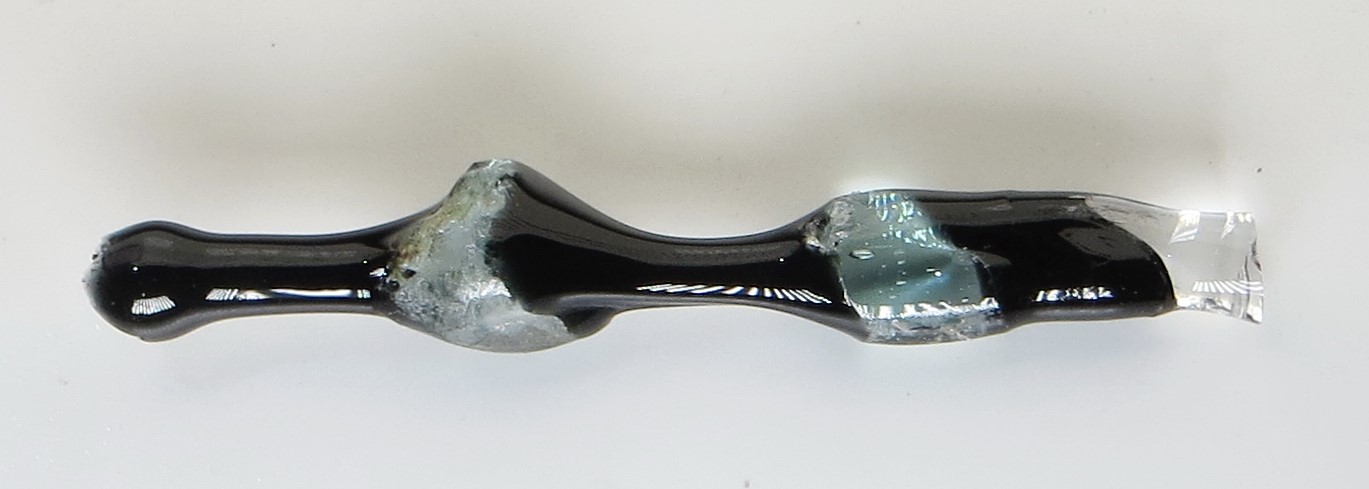 Step 6: The cooled glass, still attached to the clear rod, shows that the Roman glass was more viscous in the flame than the modern glass. Glass with a low viscosity will move further and become thinner; high viscosity will remain thick and resist being pulled (See Figure 23).