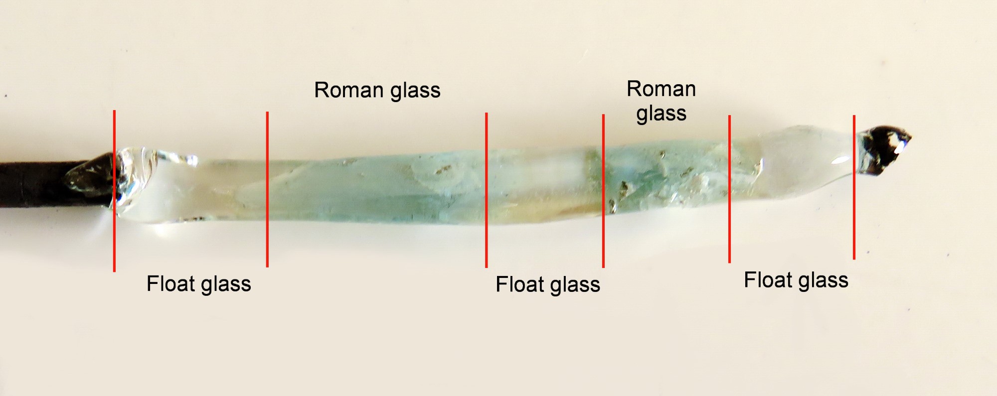The measured times are given in Table 8. It is difficult to identify a particular point when a gob of glass is soft, fully rounded, or has entirely lost its colour, and the results show inevitable variations even between pieces cut from the same glass sheet. However, the data shows at least some indication of the working properties of the glass. Laboratory equipment for measuring temperature would make this a more accurate experiment. All the modern samples of each kind are cut from a single sheet of glass.