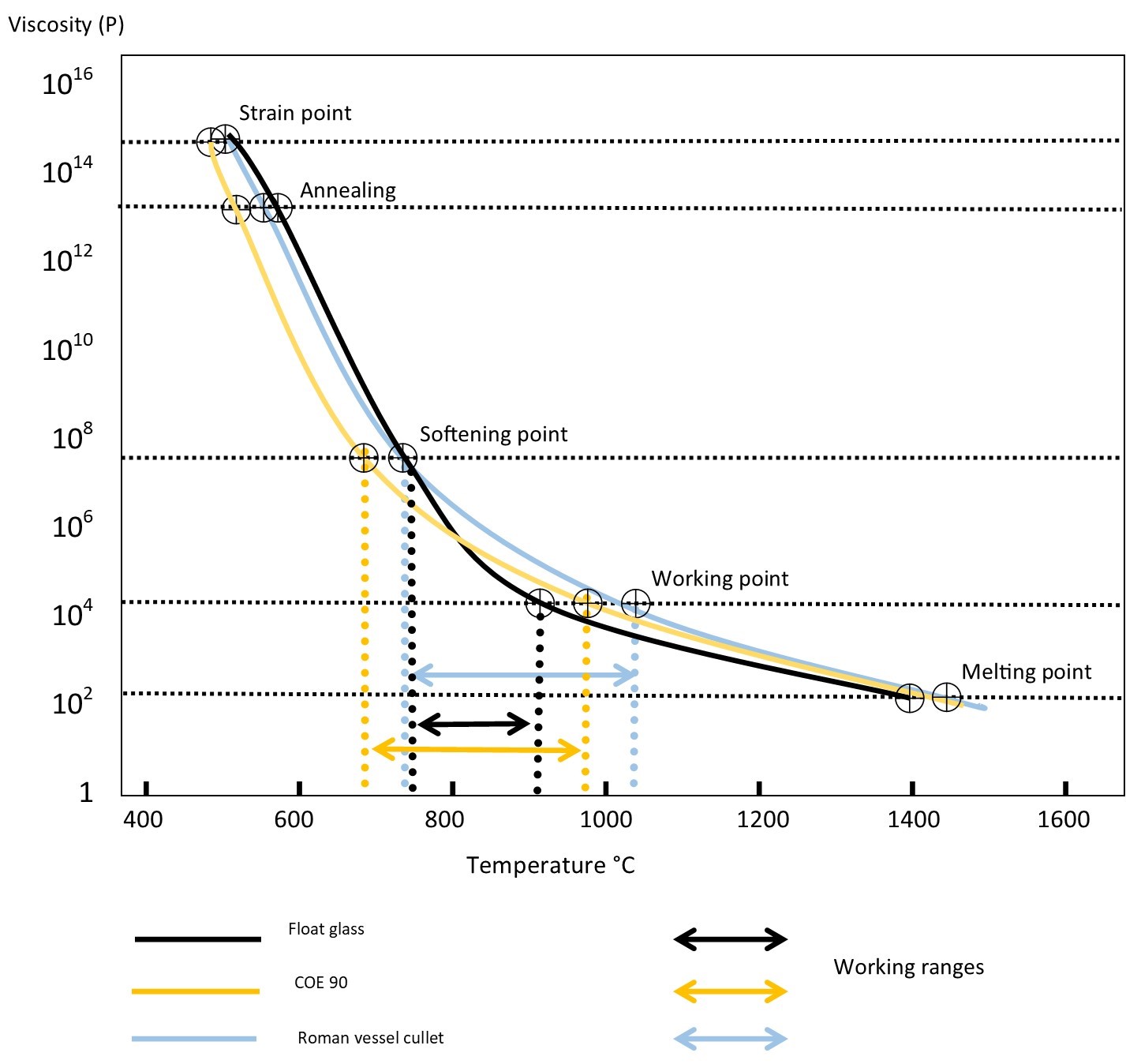 Viscosity is best shown in graph form. Figure 3 shows the calculated temperatures of the different points of transition for Roman vessel glass cullet - a typical soda lime glass.