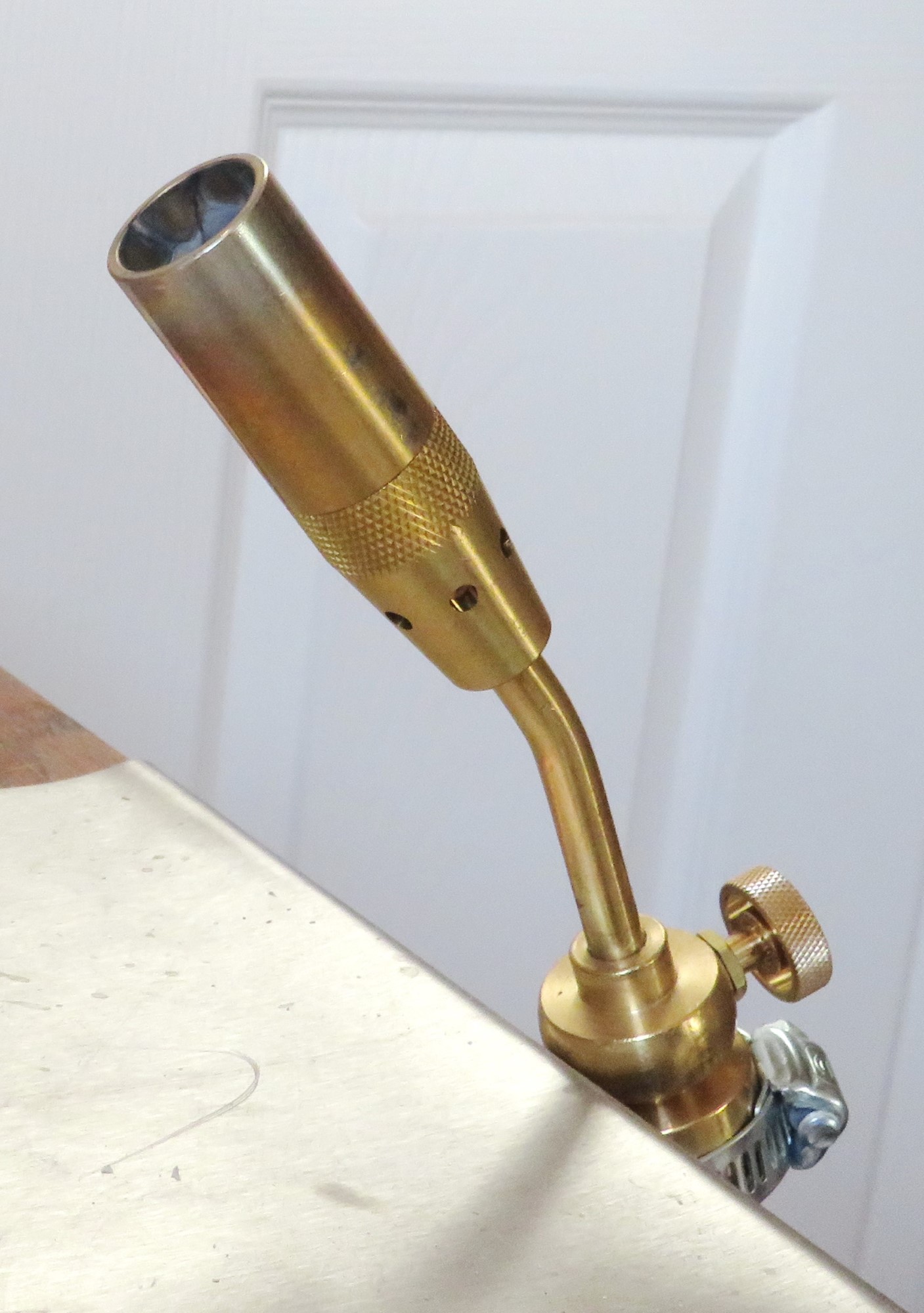 The Hothead Blowtorch is widely used by lampworkers. It is a single fuel burning torch and uses propane gas. The estimated maximum temperature of a torch of this type is 1100°C to 1250°C while an dual gas torch can be up to 2550°C. For this most modern lampworkers will use a dual gas torch that combines oxygen with propane and reaches much hotter temperatures (See Figure 32).