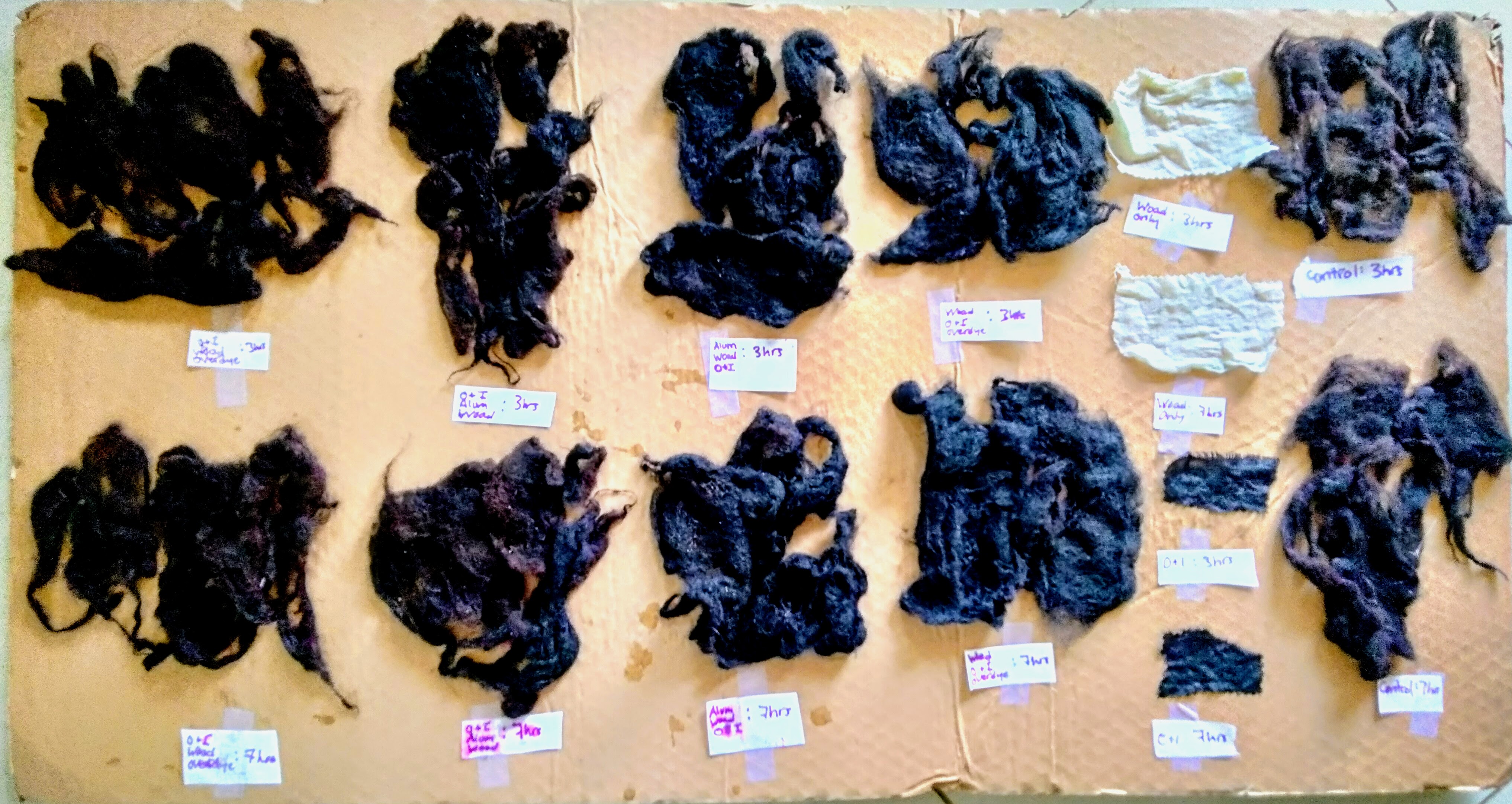 | Wool- Woad., Oak Galls and iron Water (Vat 3) | 5 | Fair (impermanent) | 2 |