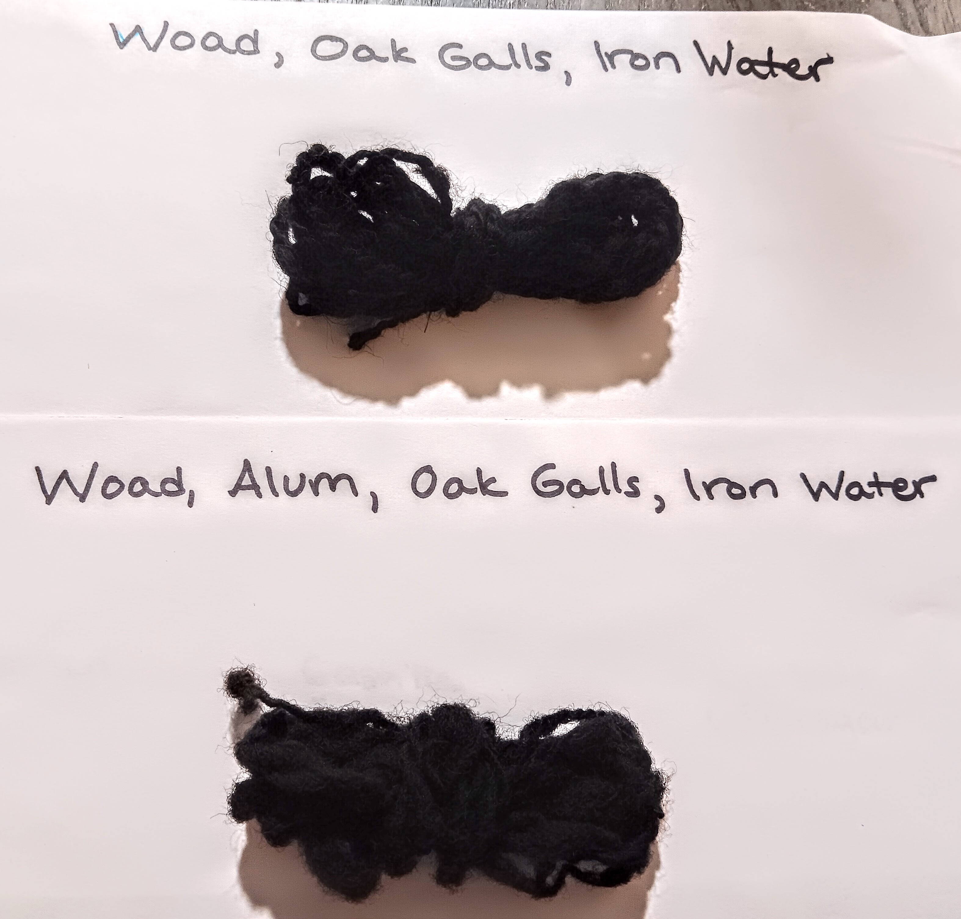 Based on the resources available and evidence for their use, there are many methods that can, and have been used to achieve strong black dyes. Adding aluminum sulfate as a compound, or from urine to the recipes can alter the colour and improve fastness. Listed below are a few of the many ways in which black hues were historically produced on wool: