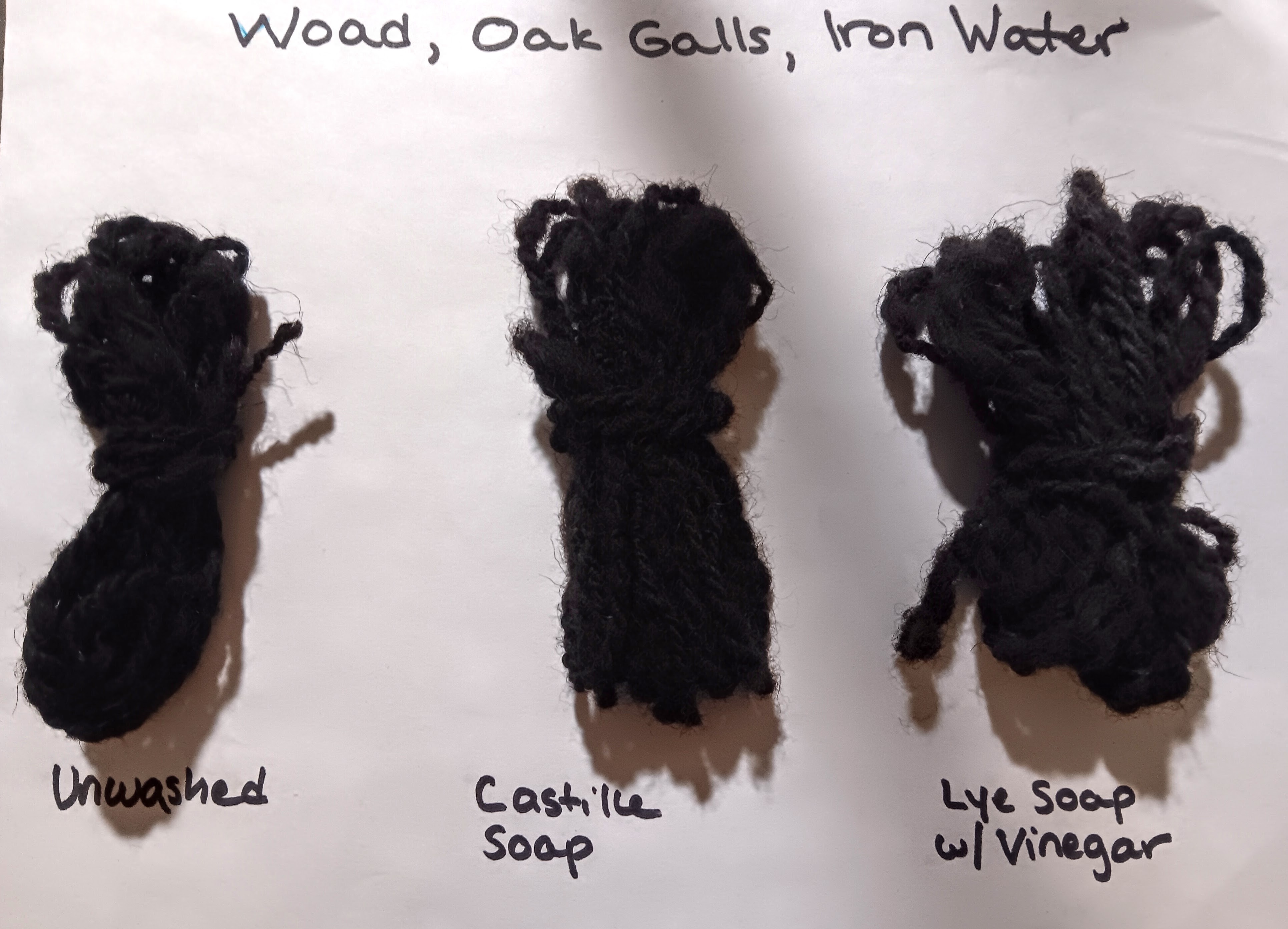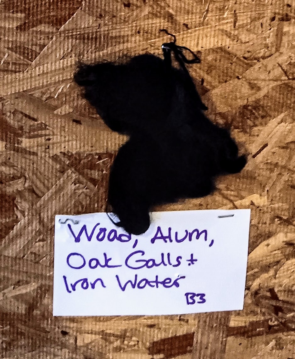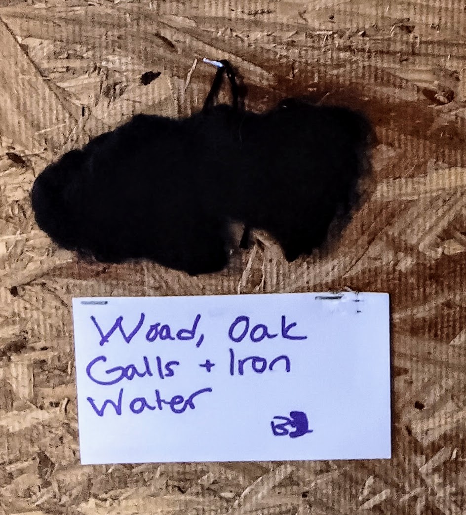| Wool- Woad, Oak Galls and lron Water (Vat I) | 5 | Fair (impermanent) | 6 Darkest (Very Black) |
