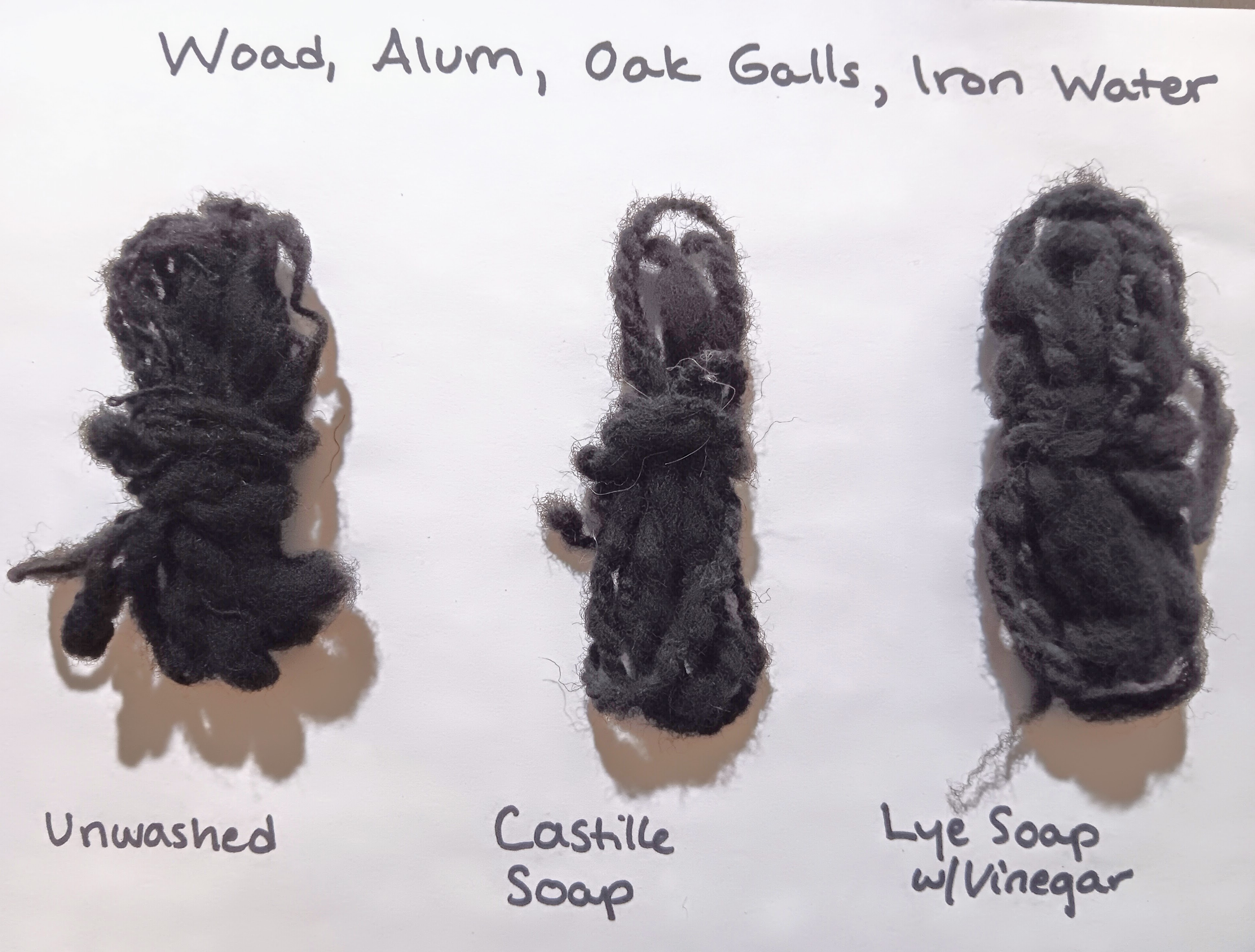 - Alum Mordant with Woad Dye, Post Mordanted with Oak Galls and Iron Water