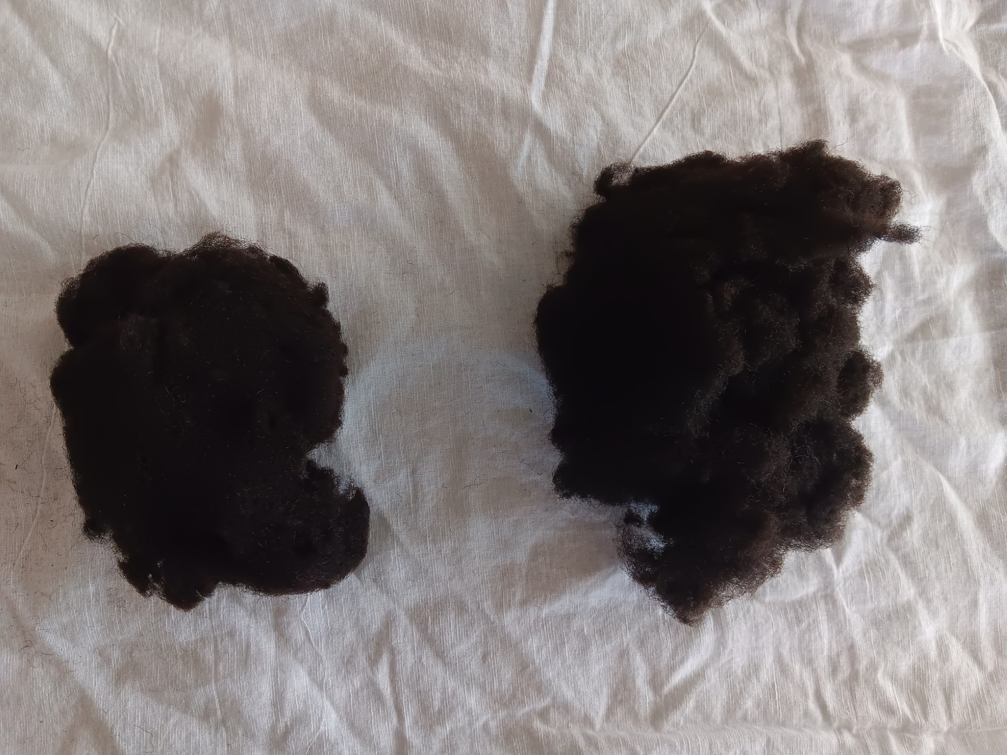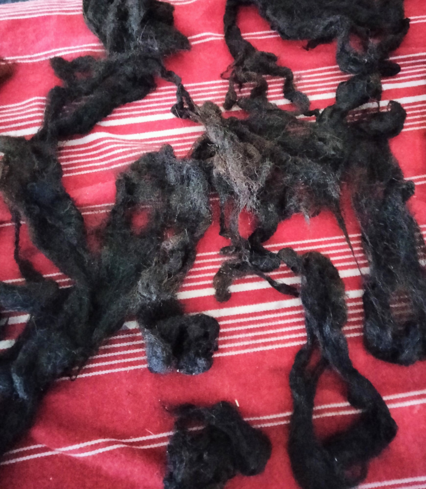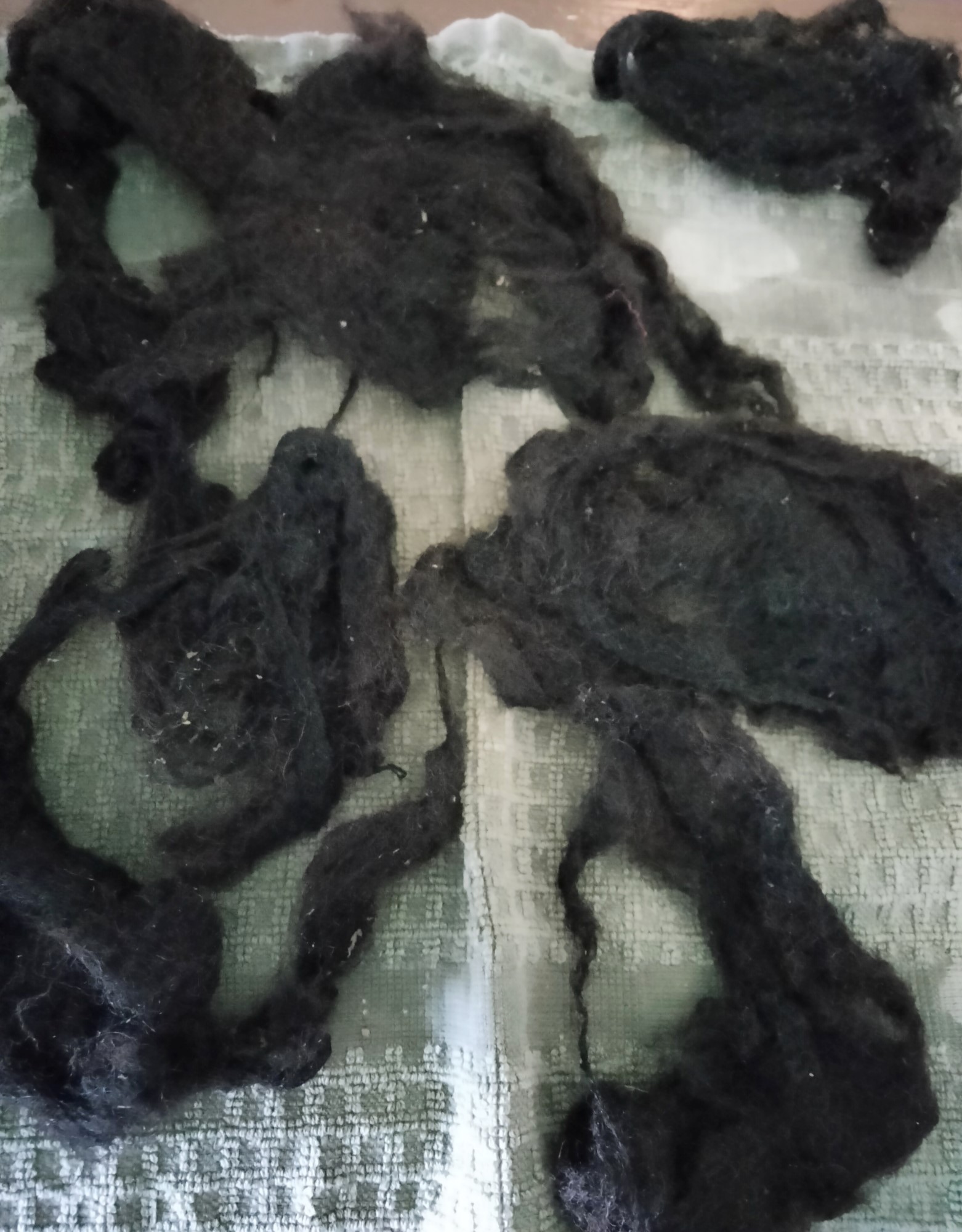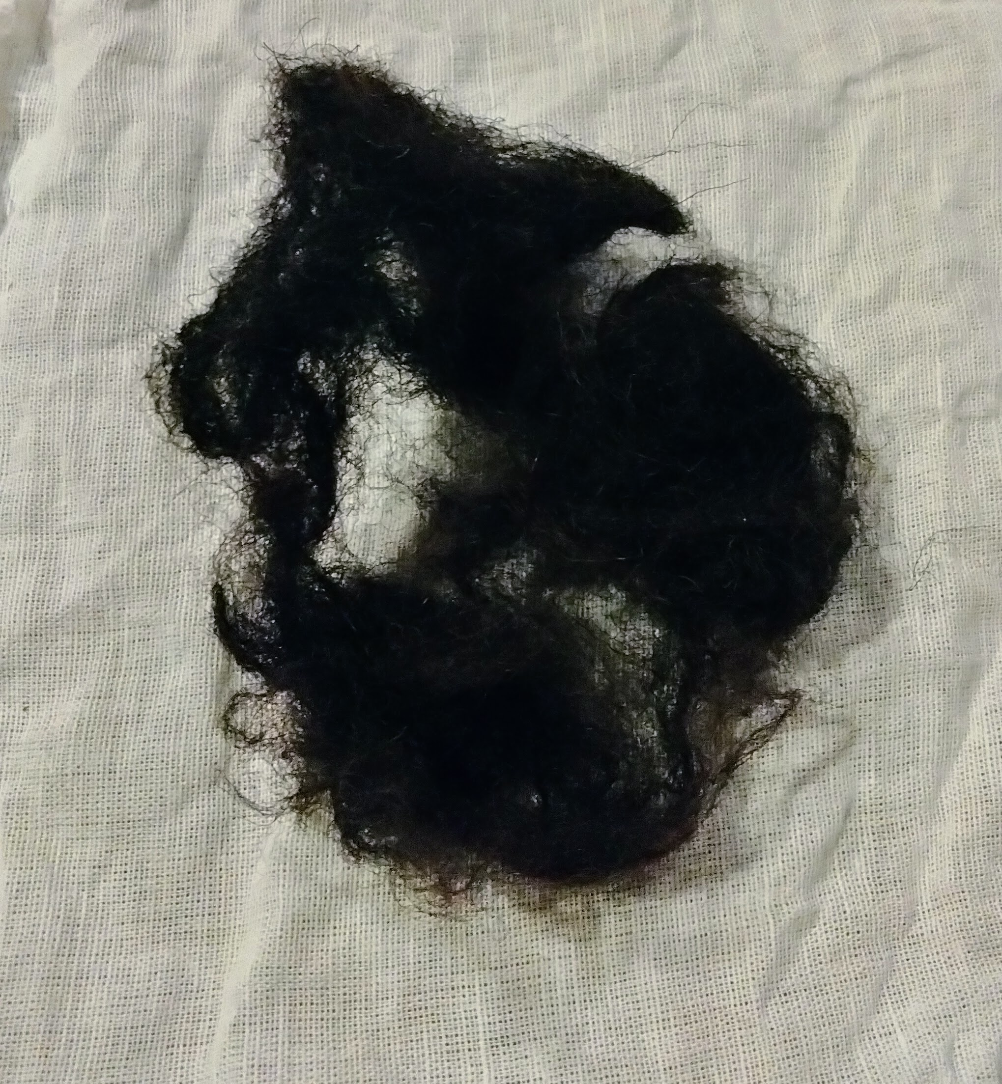 The sample of fleece treated with alum experienced a lot of fiber loss during the combing process, equating to approximately 75% of the original sample. Alum did seem to make the colour more fast, in that less dye rubbed off onto the hands of the comber and spinners. Spinning was extremely difficult, and the fibers kept breaking. Although the fibers seemed to be horrible for spinning and weaving, they were extremely soft and fluffy, and according to my spinner, seemed ideal for felting.