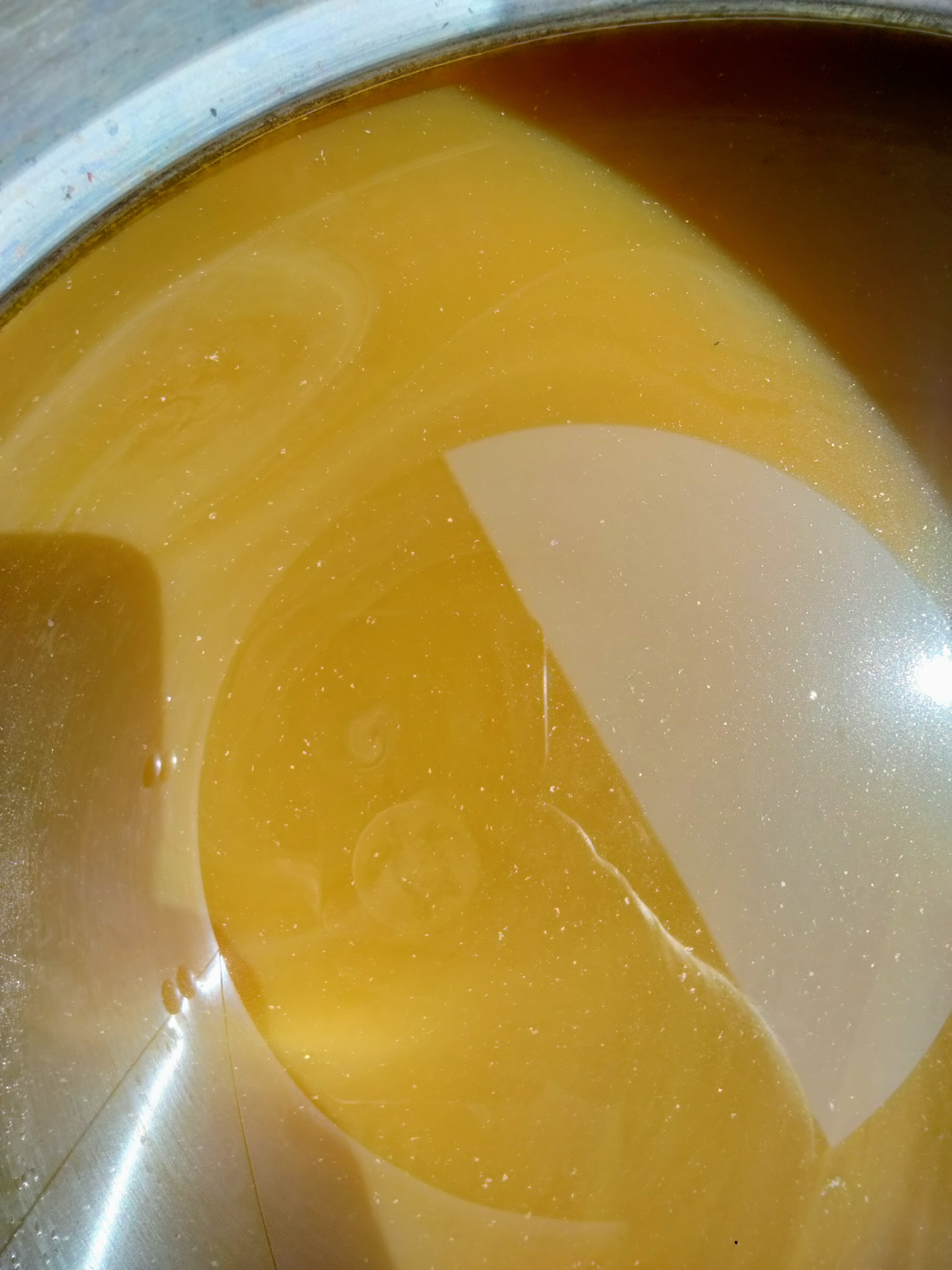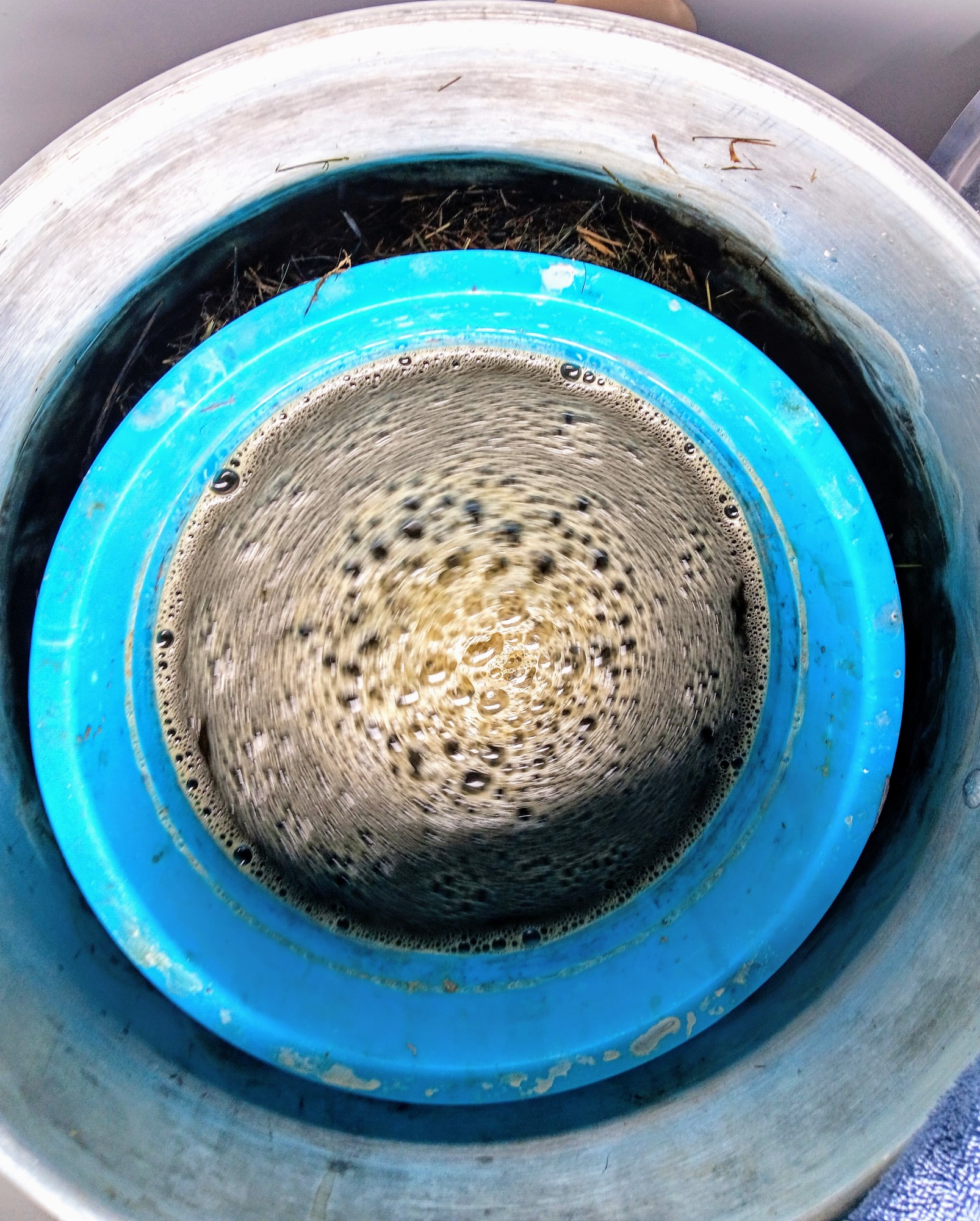It is possible to revive dead vats, so I had hoped all was not lost. The following morning, a self-heating cat mat was placed under the pot, towels wrapped around it, and on top. I gently raised the temperature of the vat from 18 to 37.8 degrees Celsius by submerging glass jars of boiling water in it (See Figure 25). I whisked the vat vigorously until froth formed, before adding 40 oz of fermented room temperature urine (See Figure 26). The vat was whisked again for 30 seconds. I returned the hot water bottles to the vat to help maintain the temperature, put the lid on and draped a light blanket over the top, and left it to rest until morning.