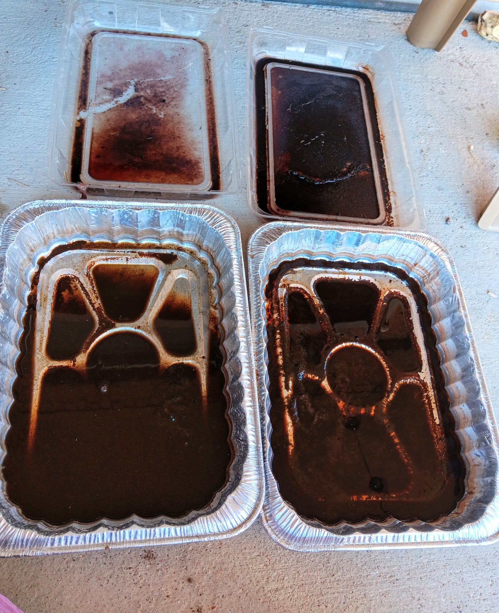 A final test dip was conducted the following day before it was suggested that there was not enough extractable pigment in the woad itself. The test dip showed no colour change. In order to dehydrate the vat, it was poured into four shallow pans, and left in a sunny area of a covered patio for two weeks. If there was substantial extracted indigo in the vat, a blue crystalline substance should have been found in the dried pans. Only reddish powder from the madder remained (See Figure 27).