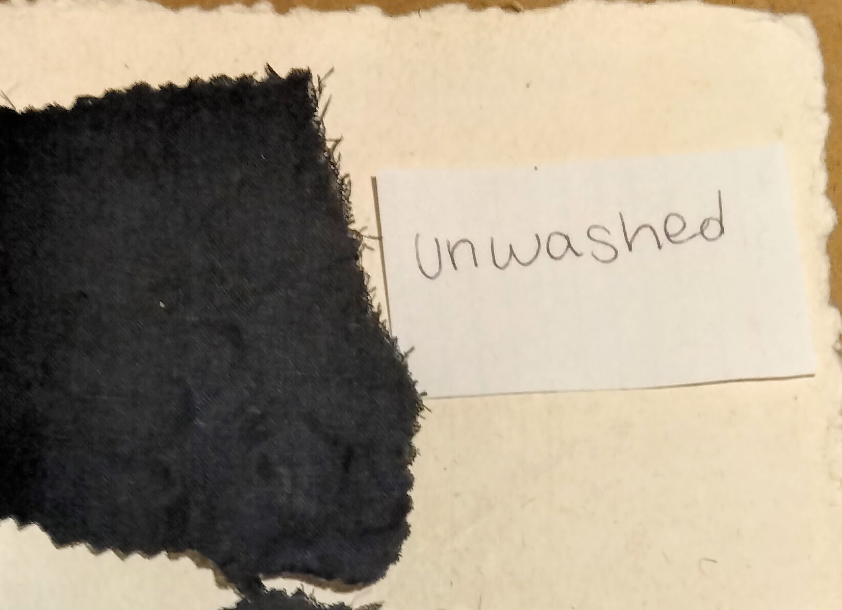 | Wool- Woad, Alum, Oak Galls and Iron Water (Vat 3) | 3 | Poor (Fugitive) | 1 Lightest (Distinctly Dark Brownish Black) |
