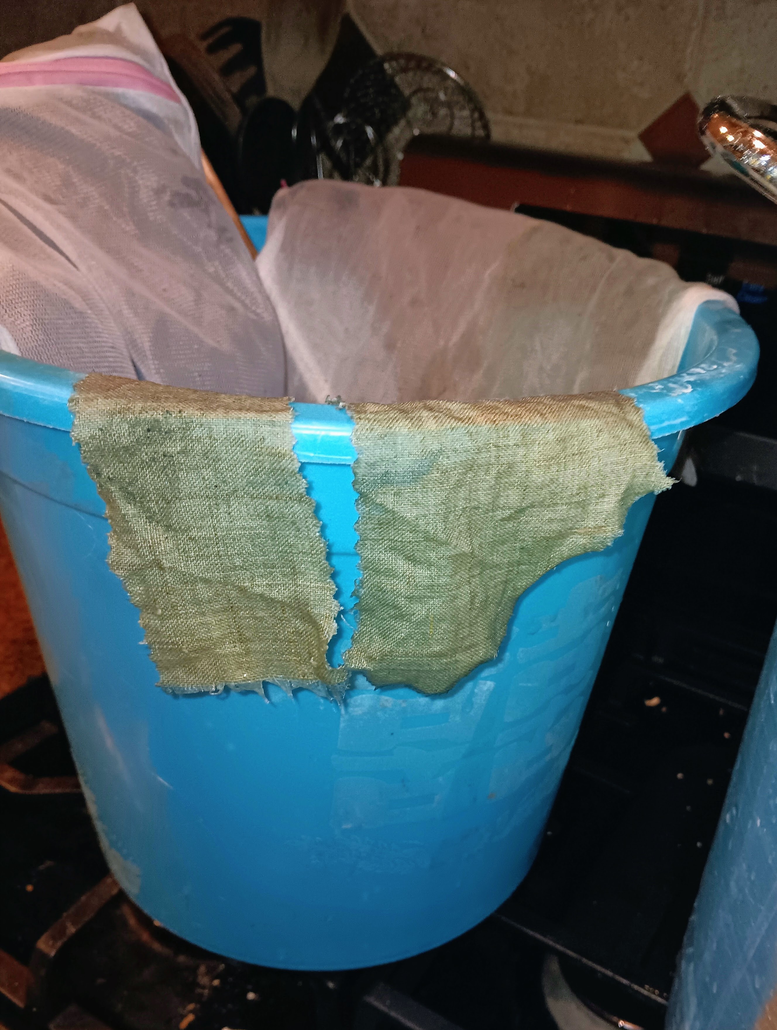 After adding the oat mixture, I let the vat continue to ferment for four more days. By day 15, the vat was very yellow in colour and the smell had become much more fermented, similar to kombucha. I conducted a 15-minute test dip on bleached white linen. Although a small amount of pigment seemed to impart on the cloth, the vat was far too weak.