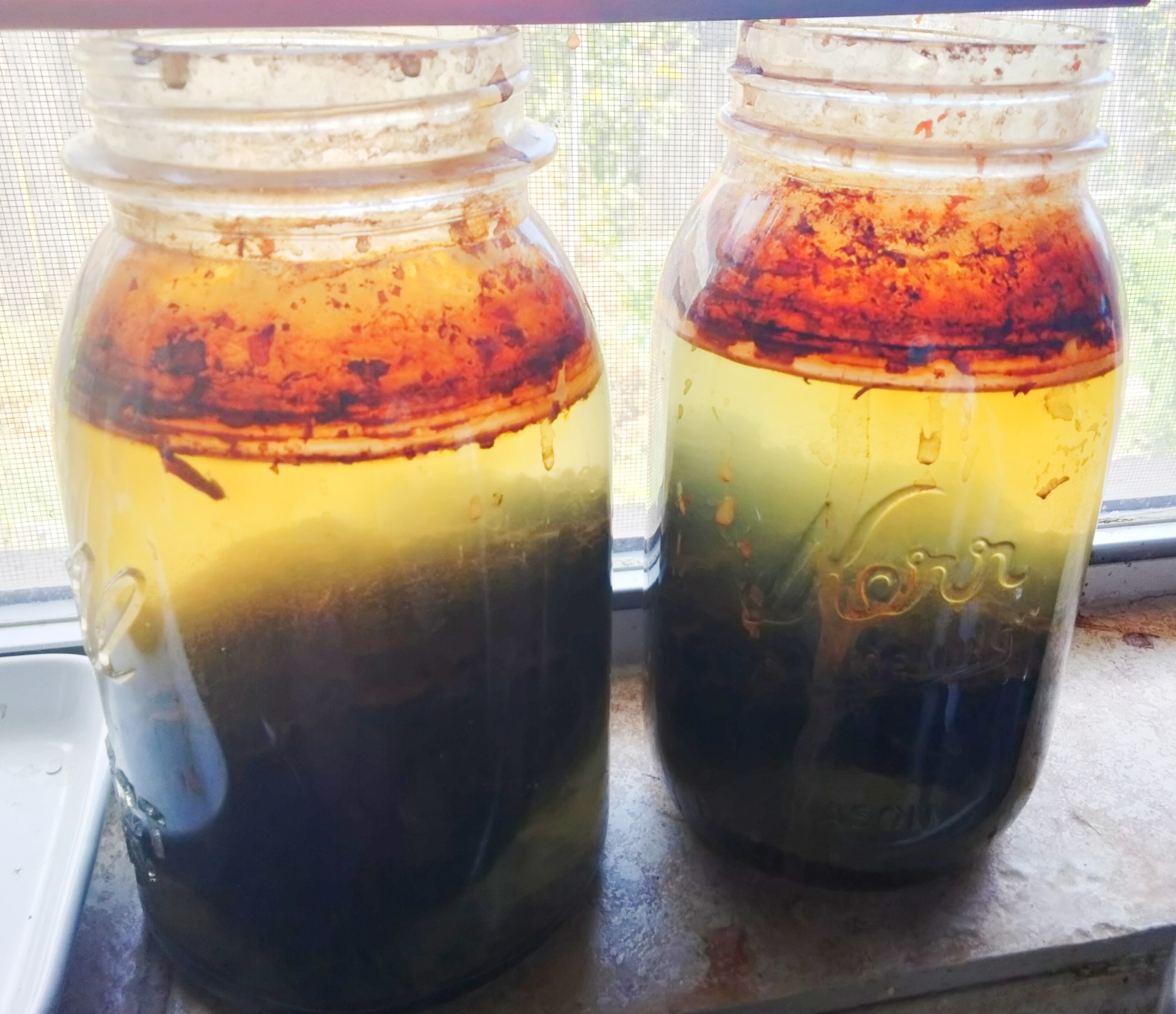 - I allowed them to sit for about two weeks, stirring twice daily. The solution became very dark with a lot of sediment. Containers can be covered loosely if at risk of being contaminated. Sediment will begin to form on the bottom of the jar by the end of day two (See Figure 3).