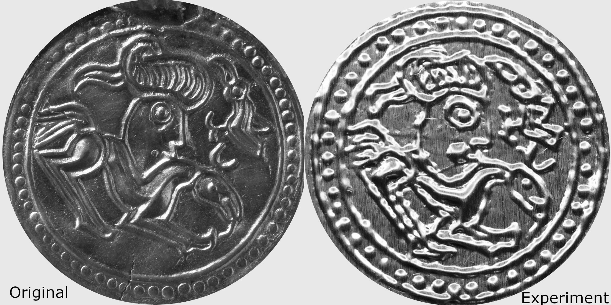 To test the assumption that wooden matrices, if used, could only have been involved in the production of a single or very few bracteates, a series of 15 bracteates were struck in rapid succession on the same wooden matrix. To assess how quality is impacted by the number of bracteates produced on the matrix, two different methods to assess quality were used.