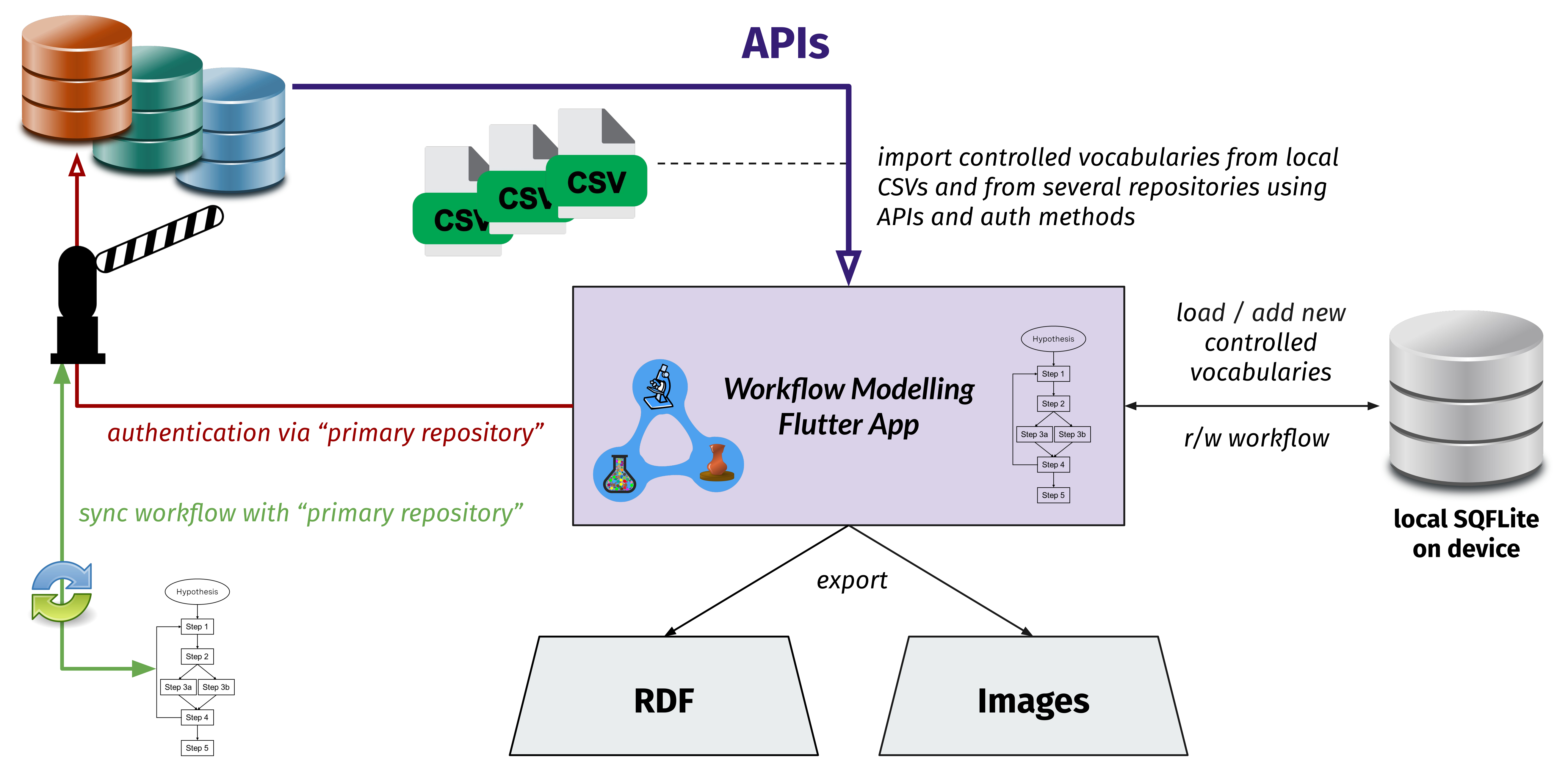 - There are numerous other software packages with many interesting functions. Instead of re-creating these functions in the workflow tool, it is much more sustainable to be able to connect to other software packages via so-called Application Programming Interfaces (API). For example, the workflow tool could connect to an Electronic Lab Notebook (ELN) to access the instruments available in a given institute or the data/metadata acquired during the experiments, or interact with other research software frameworks using their APIs written in, e.g., Python or JavaScript to expand its possibilities.