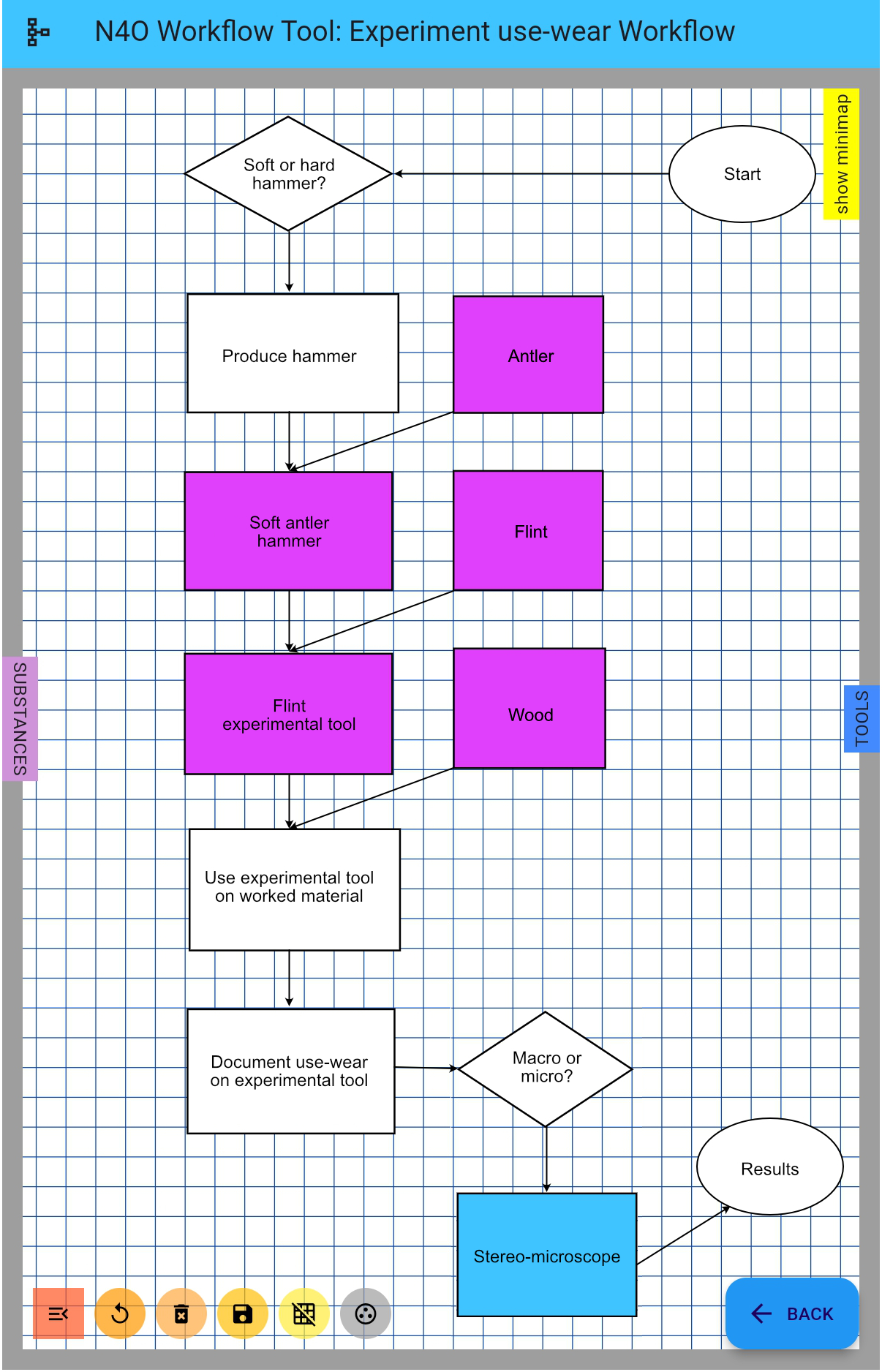 Once populated with resources, the tool is intended to be easy to use. Experiments will be designed using a flowchart (See Figure 5). When accessing the flowchart screen, a database query will populate a menu of shapes representing relevant choices (i.e. available resources and associated actions) that the user can select and drag onto the screen to create a workflow. The process will then be structured grammatically: an instrument or tool will be used to perform some action (i.e. task) on some compound or substance. The user can specify which person will perform the task (if there is a choice; experience levels might help indicate which person is most suited to performing a given task), make comments about potential problems or expected interim results, which instrument settings might be most suitable, etc. In terms of design, the flowchart follows the noun-verb-noun structure, represented vertically with an optional link to the person doing any given action (if one person does all the work from beginning to end, adding extra personnel seems pointless) projecting from one side, and the relevant settings for given instruments on the other. A side-link could be added to decisions -traditionally represented as diamonds- identifying which "reference" may have been used as an authority, guidance or inspiration when choosing one tool or method over another, why any number of alternatives were rejected, etc. Recording -and reflexively directing more attention towards- the decision-making process was always one of the main goals when designing the workflow tool. The flowchart allows looping, as when certain actions are repeated any number of times: using a bronze axe to chop a tree a given number of times in order to gauge its effectiveness, for example.