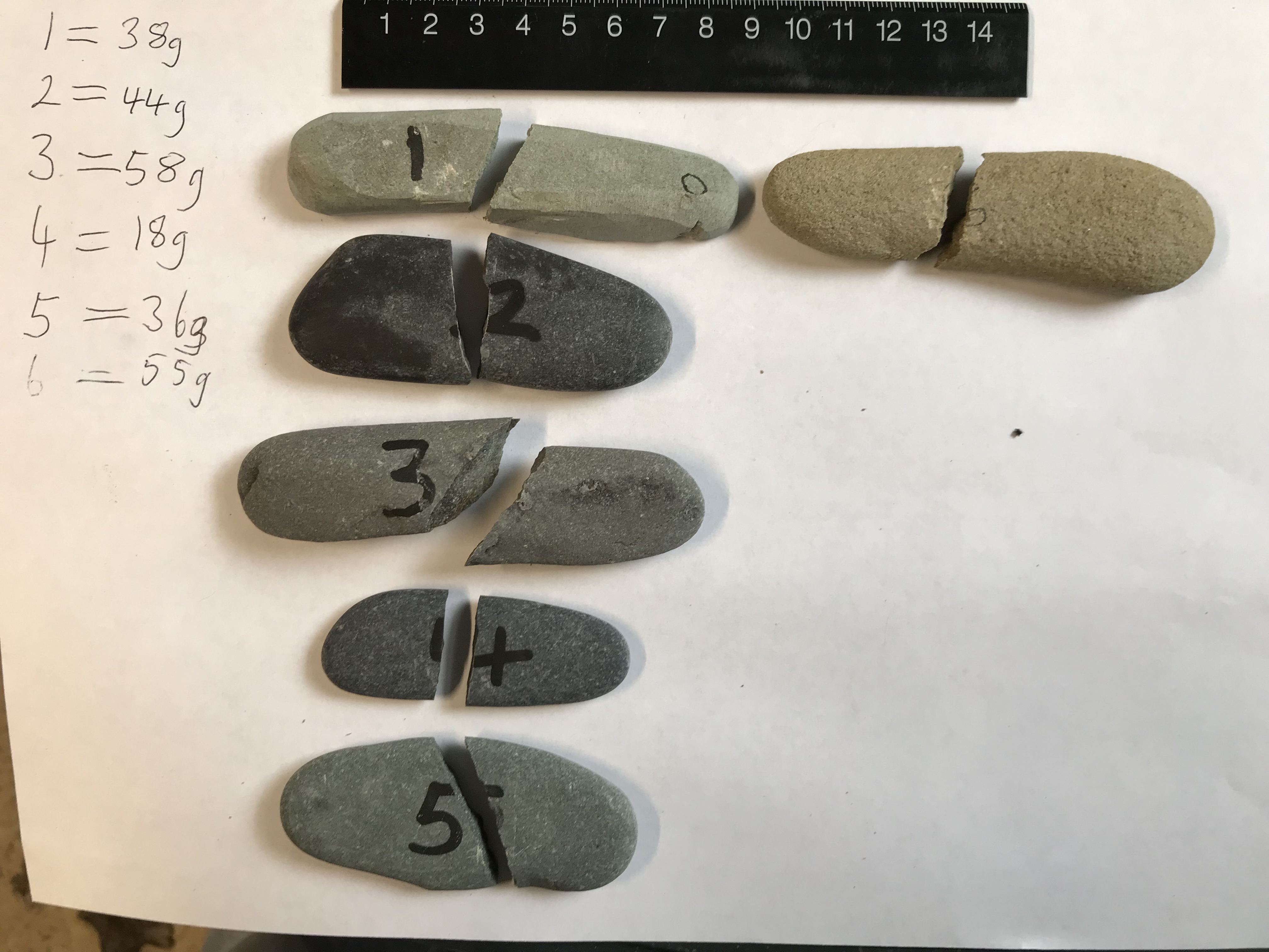 The possibility then arose that the stone wrist guards were vulnerable to metal blades but might be protective against stone weapons. It was decided to repeat the tests but with a proxy for a prehistoric stone knife or dagger. In this experiment, six stones of approximate size to the wrist-guards, and one much larger for comparison, were picked on a beach (See Figure 11). As can be seen from the illustration, they are of widely different shapes and sizes. The largest, 157g, could not possibly be worn on the arm except in extraordinary circumstances; the others seemed more plausible.
