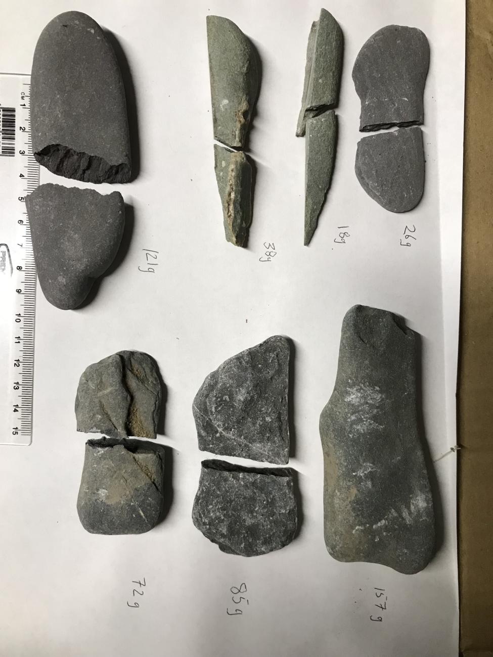 A stone of approximate similarity to a prehistoric stone knife was used (See Figures 12 and 13). The proxy knife was probably more robust than an actual stone knife of the time but was considered close enough. The second tranche of stone proxy wrist guards were measured and fastened to the proxy arm and struck with the knife. When tapped with the stone knife, with gentle pressure, all but one shattered easily. Interestingly, the 38 g stone was struck where the small white patch, indicated by a red arrow, shows on the image, but it shattered along a fault about 2.5 cm from the impact site. Despite my best efforts, the large 157 g stone could not be broken by the stone knife. Figure 14 shows the stones after impact. The fragility of the wrist-guards when tapped even quite moderately makes it difficult to think they were in any way defensive.