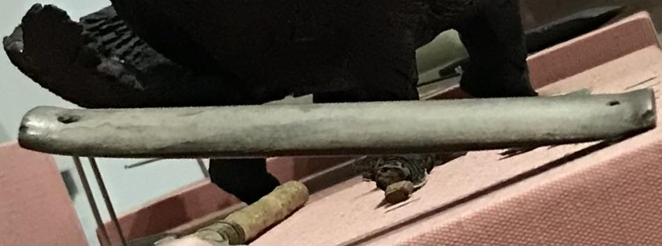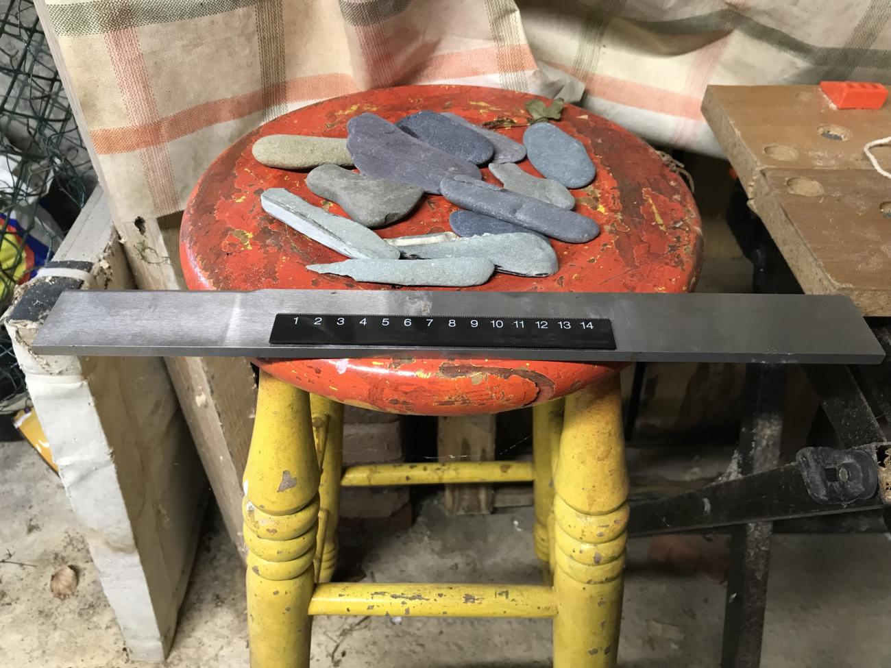 As wrist guards appeared in the early years of the discovery of copper metal, a proxy sword was made from a blunted metal strip similar to the back of a kitchen bread knife. One by one each 'wrist guard' was tapped quite gently with the proxy sword as a preliminary to striking with moderate force, more or less as one taps a nail before hitting it with a hammer. In the event, the taps broke each of the stones with the first impact. Interestingly the stones did not always break along the line of impact, demonstrating their brittleness and a tendency to break along the lines of existing faults.