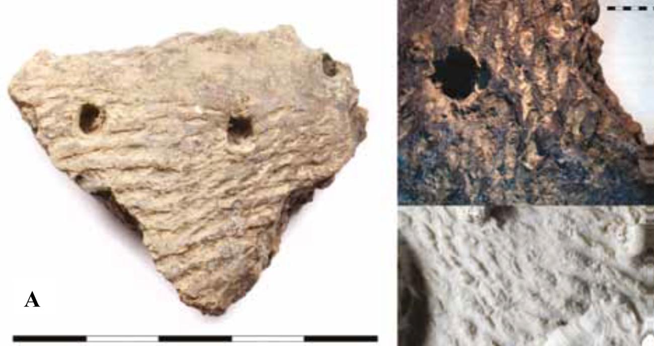 The author described Type 2 as impressions found on the outer surface of vessels, characterised by narrow furrows which often exhibit steep walls and sharp ends. It was also suggested that Type 2 (See Figure 1A) sherds "show rows which may at least partly belong to loosely twisted two-ply ropes [...] wound around a stick and rolled over the surface of a pot" (Rammo, 2017, p.115). On the other hand, Type 4 (See Figure 1B) sherds feature wavy diagonal rows with an arched shape, sometimes arranged in a net of notches and grooves. These impressions could have been left by plain weave textiles made primarily with plant fibres, even though the nÄlebinding technique has been suggested as well (Kriiska, Lavento and Peets, 2005). Another hypothesis consists in the use of two different unidentified textile items, as the grooves and notches resemble two distinct textile systems. The possibility that these impressions were not derived from textiles was also taken into account, as shown in Lopatina (2015).