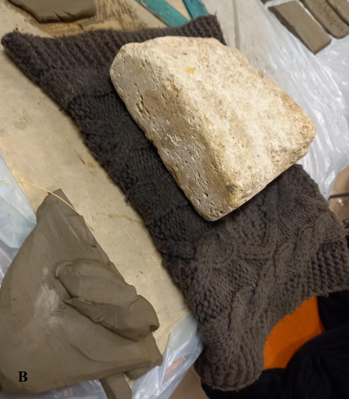 Two types of decoration were applied (See Table 1 for details on individual tablet decoration). The first involved impressing a moist woollen cloth using a rounded piece of wood (See Figure 3A), which was subsequently replaced by a quadrangular stone (see Materials and Methods section; Figure 3B).