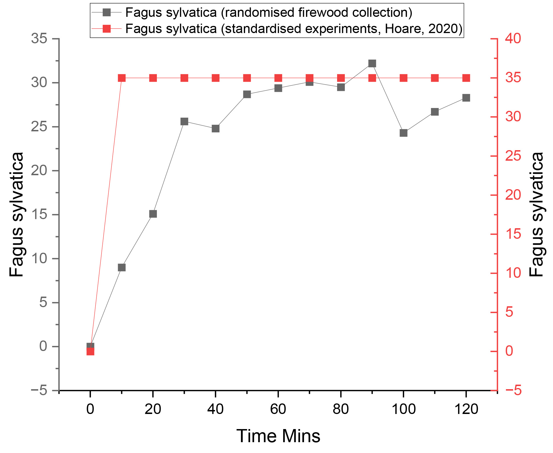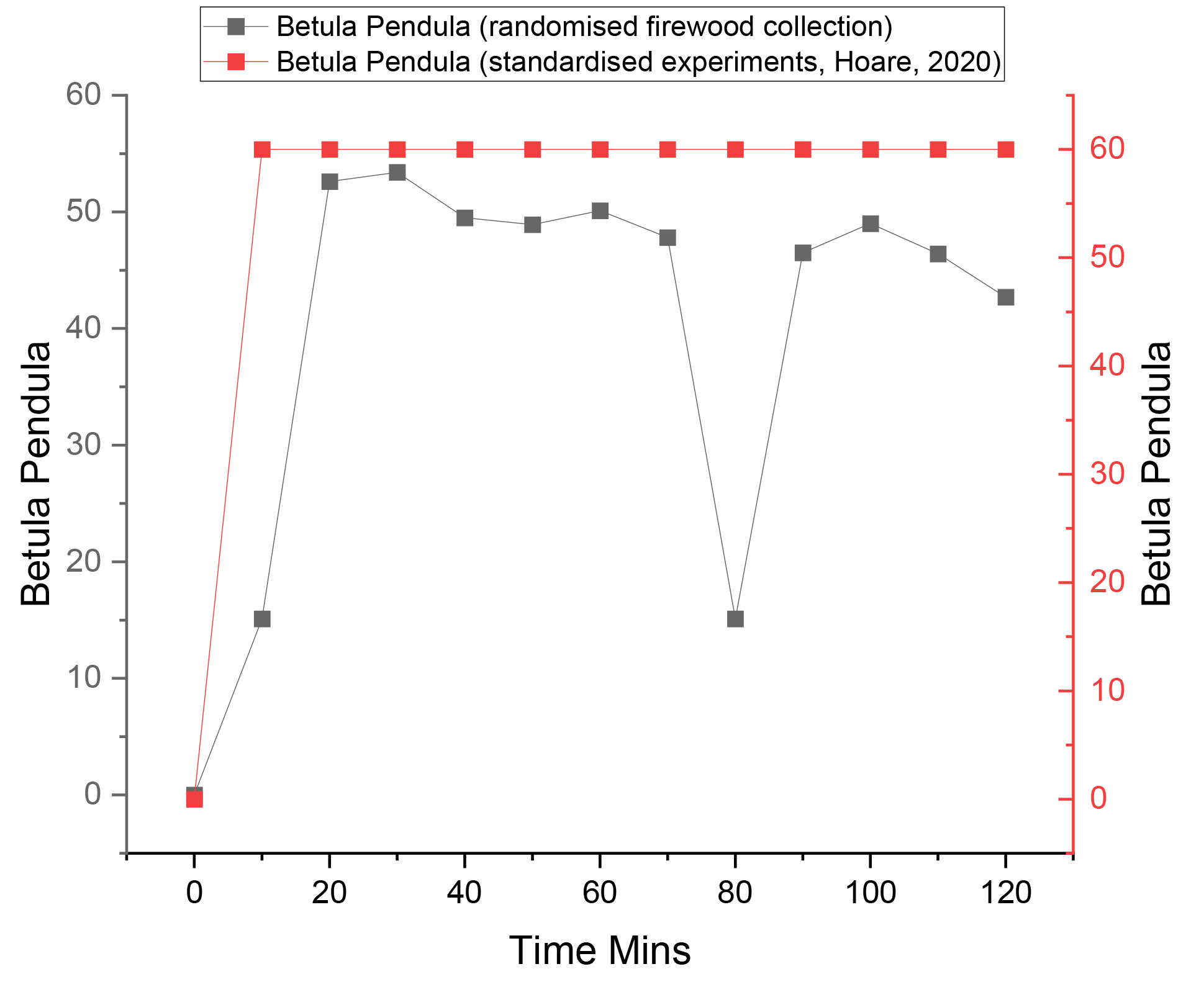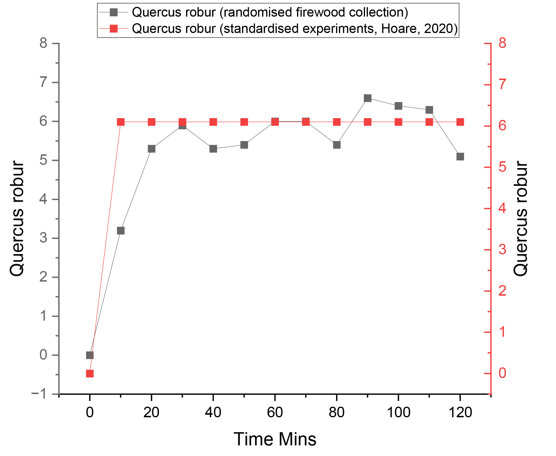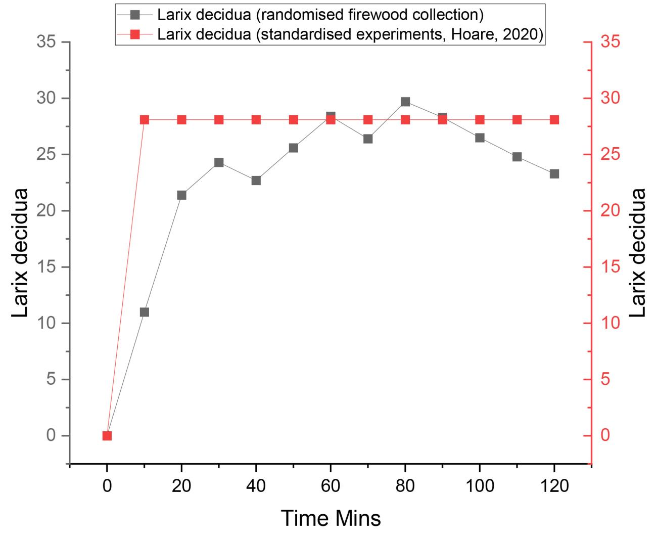 The results of this study quantified the outgoing light properties of seven experimental fires, each using a different wood species and employing a randomised firewood collection strategy (no controls on the size, state or moisture content of the wood). The study also used a flat hearth design rather than a pyramid stacking design. Analyses of the hearth temperatures were also quantified in tandem with lux measurements. The aim was to examine whether the variation in illuminance observed between individual wood species during standardised experiments with set protocols (concerning the size, state and moisture content of the firewood, e.g., Hoare (2020) could be replicated using a firewood collection strategy and hearth design more representative of prehistoric hunter-gatherers.