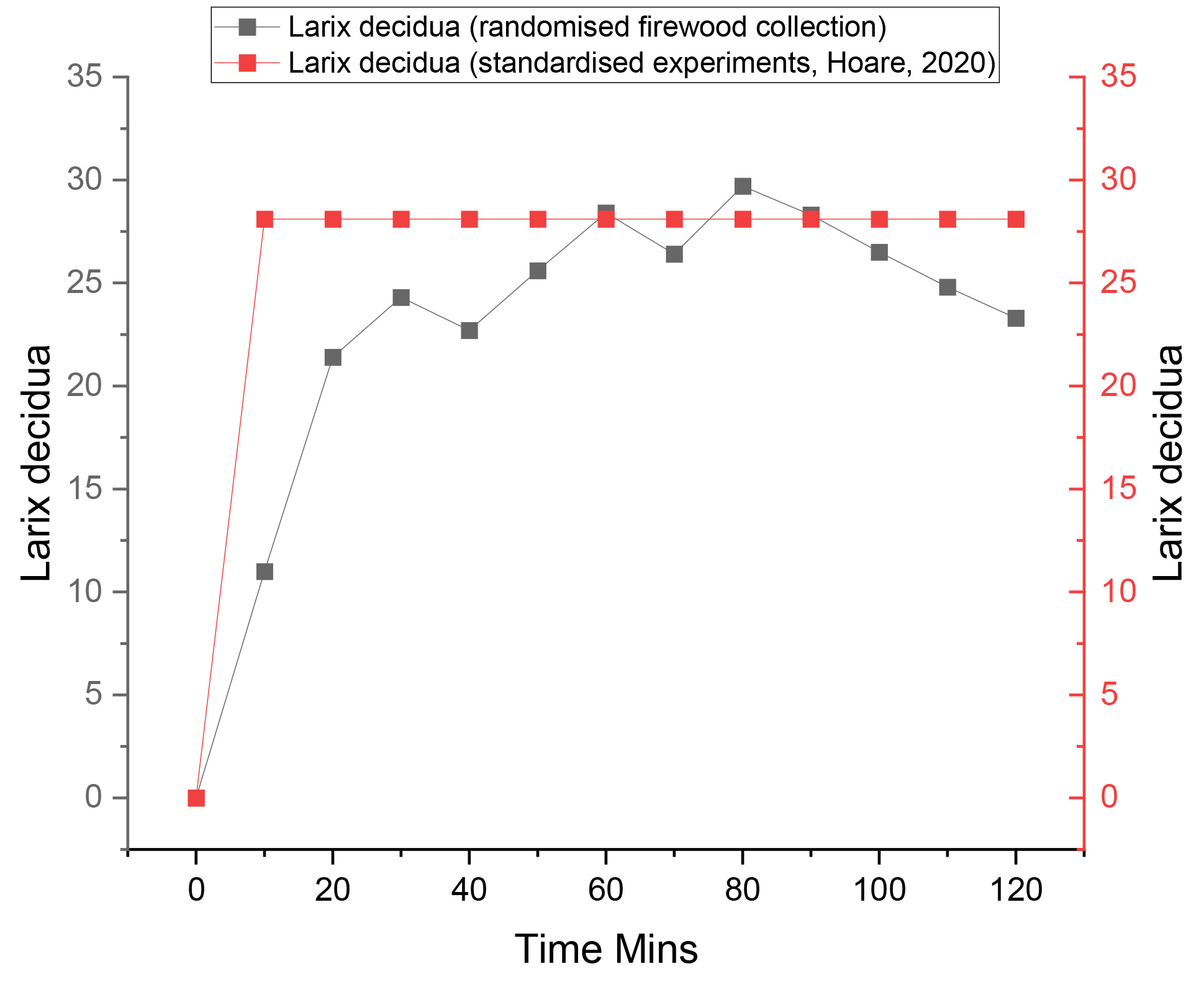 The fire was ignited at 6.00 pm and the measurements were recorded for 120 min. There was no rainfall, and the wind speed was 0. The maximum temperature of the fire was 891°C, with an average of 650°C. The highest lux measurement was 29.7 with an average of 25.5 for the full 120 min. Peak values recorded in Hoare (2020) were 28.1.