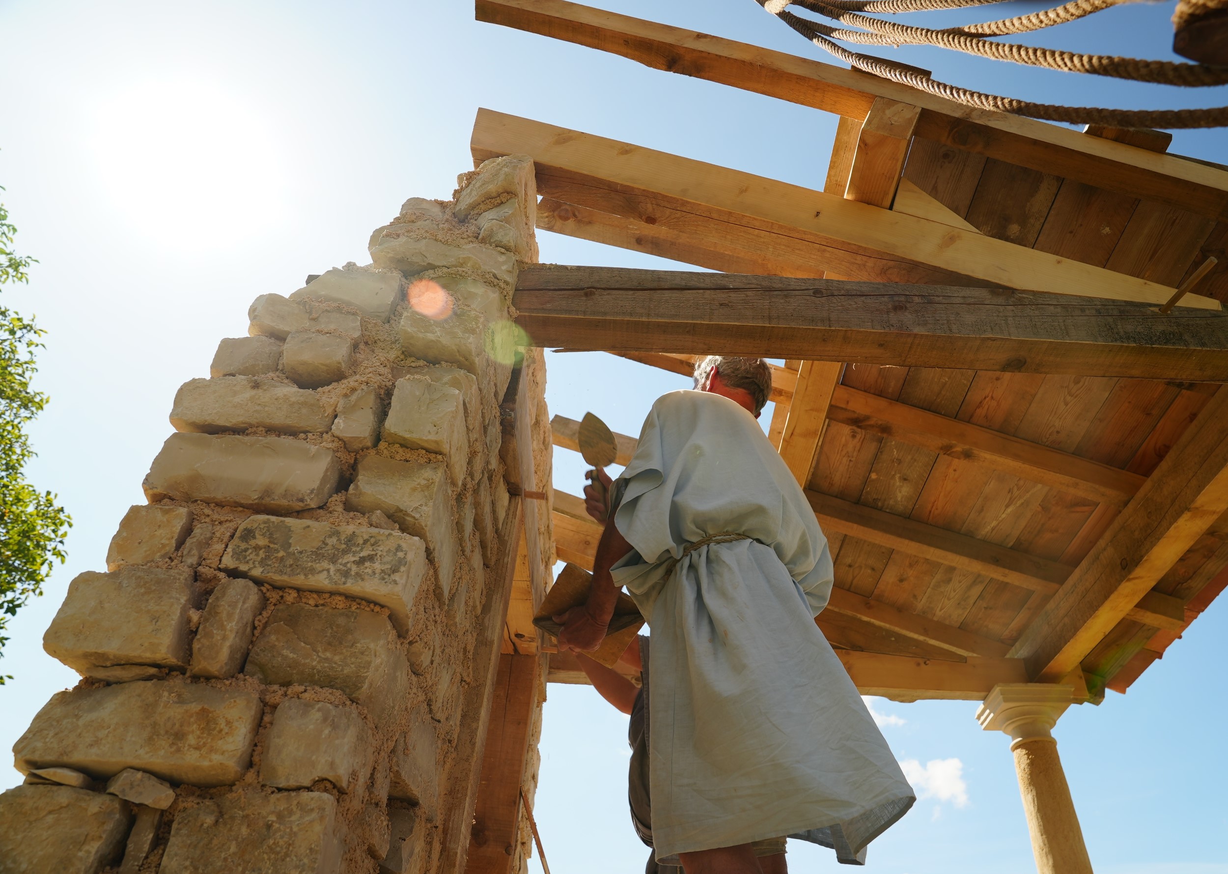 The roof was tiled with replicas of seven tegulae and eight imbrices. Our tilemaker was diligently shaping more tiles and moulding antefixes, but the drying and firing of these elements could only take place weeks after the event. Therefore, we employed pre-made tiles. On a table, the tilemaker threw clumps of clay into the sanded wooden frame that is used to shape the tegula. Then they shaped the edges with their hands and wooden sticks. After removing the frame, they cut the notches on both ends of the tile, which are necessary to allow the secure overlap of the tegulae. The imbrices are simple slabs of clay shaped on wooden moulds. The tile replicas were assembled on the rafters without any joint or nail, as was the custom in the Roman Empire. The weight of the tiles and the slight slope of the roof meant that the tiles did not require the need to attach them by other means. This partial roofing was merely an evocation of what ancient buildings might have looked like, because we lacked the necessary materials for the fabrication of the dozen more tiles needed to complete the roof. For disassembly reasons, the imbrices were not set into mortar strips on the tegulae joints, which was often the case in ancient times. Finally, the lower-end tiles would usually be fixed to the timber roof with large nails or even terracotta antefixes, which were also not applied for this project.