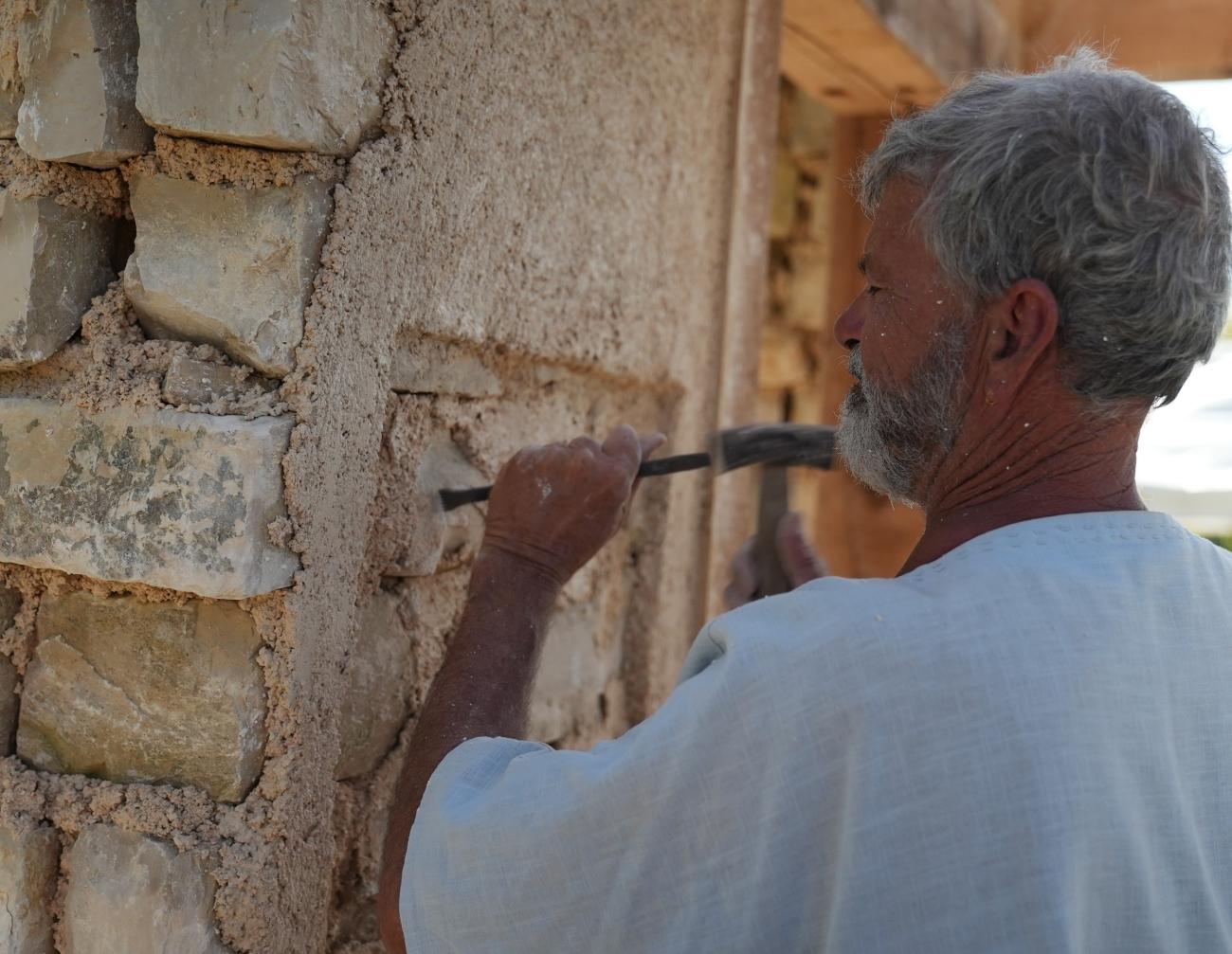 The levelling of each course was constantly checked with a plank and a libella, while the verticality of the wall was verified with a square level, the combination of a square with a plumb line and half an archipendulum. Two rows of putlog holes were arranged in the wall. The first one served to support the simplest scaffolding: two planks supported by two wooden poles. It was set as square holes on each side of the door, at 1.20 m of height. This rudimentary mode of scaffolding was entirely sufficient for such a simple wall, but the dampness of the gypsum mortar meant that we had to create through-holes, where the whole thickness of the wall could support the beams. The second row of holes served to insert the tie beams. They are meant to be through-holes, as the continuation of the truss beams inside the building would serve as joists for its upper floor.