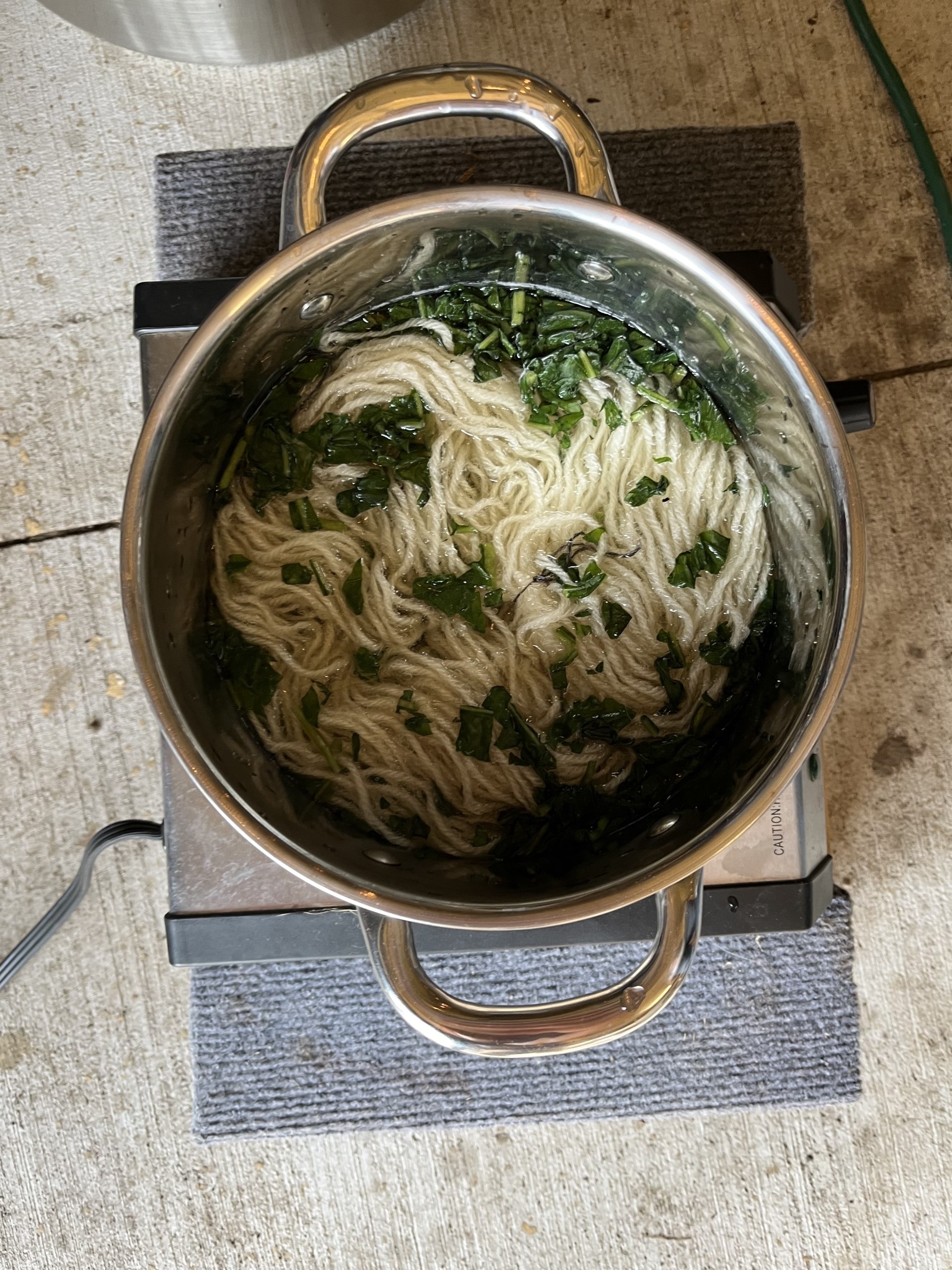 - Add pre-wetted, mordanted yarn and bring liquid up to 32 degrees Celsius, then up to 82 C