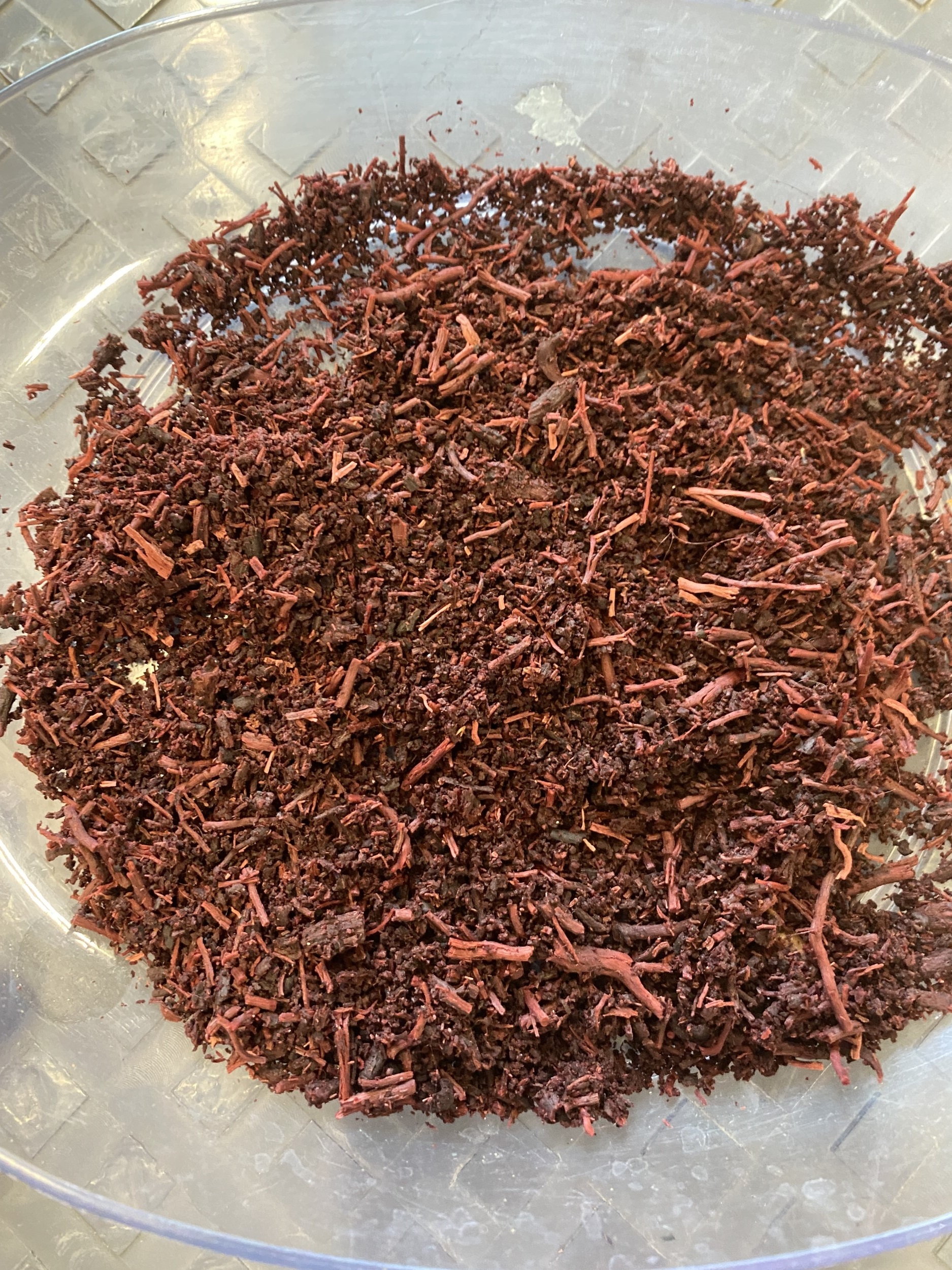 While we mainly focused on woad, we were also interested in working with other natural dyes to build out a "medieval colour palette" of Northern Europe, as well as to gain a point of comparison for dyeing with woad. For this, we focused on madder and weld, which together with woad were the most common sources of primary colours in medieval Northern Europe (Owen-Crocker, 2021, 102) see (See Figures 13 and 14). For instance, there is evidence of both woad and madder being two of the three primary dye sources used in the Bayeux tapestry (Owen-Crocker, 2021, 103). Weld is a plant which gives a bright yellow colour, while madder is a root that gives a deep red (See Figures 15 and 16). We found working with weld the most straightforward of any of the dyes that we worked with as it involved a simple boiling and steeping process, resulting in a very vibrant, sunny, yellow.