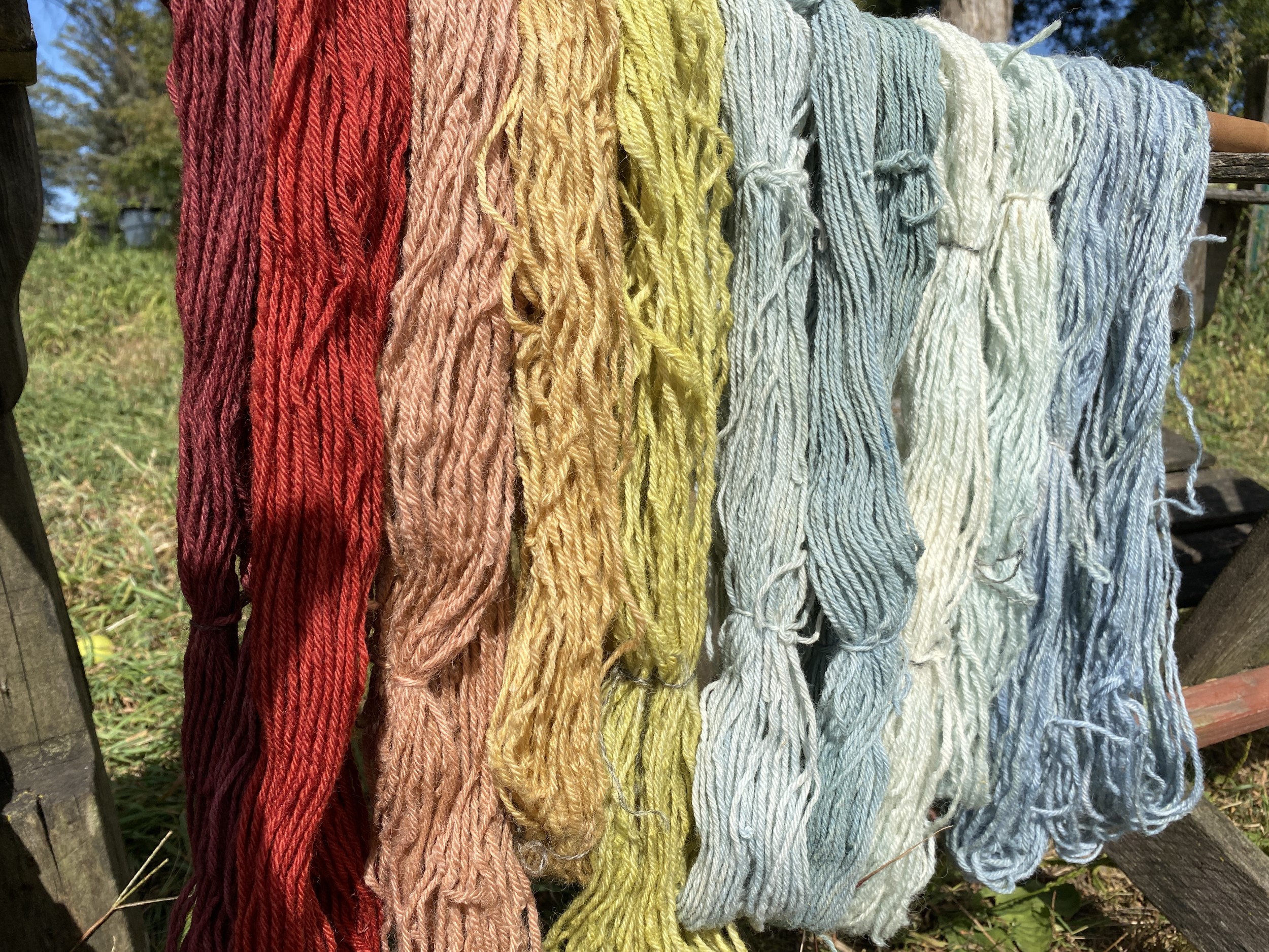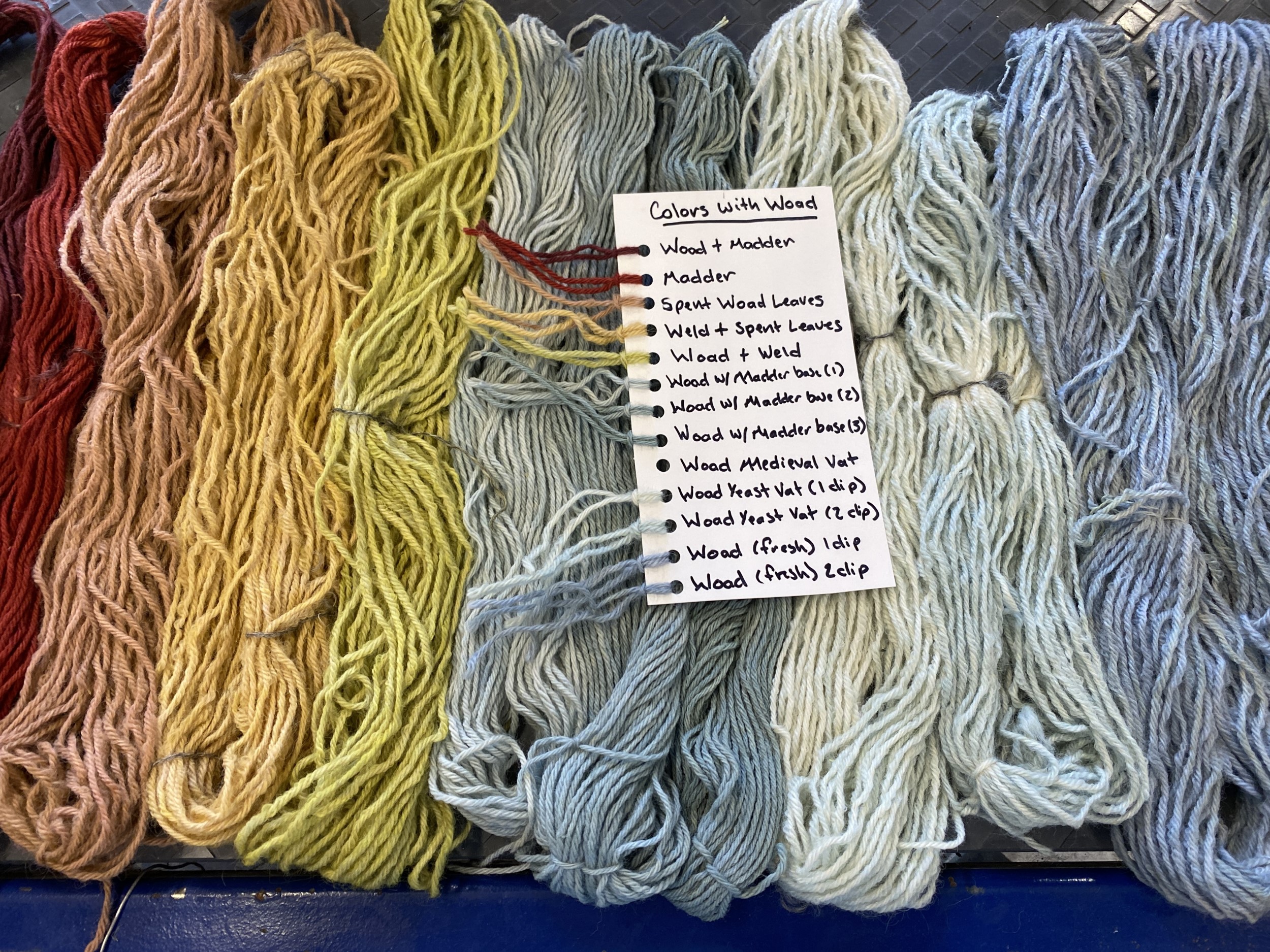 There was a great deal of trial and error involved in our process of using modern woad dyeing methods to get the best blue colour possible. One significant finding was that the hardness of the water greatly affects this process. The well on the farm had quite hard water, and when we switched to filtered water, we got darker blues more consistently. This is consistent with period sources that suggest that rainwater was preferable for dyeing. An early modern dye manual, The Plictho of Gioanventura Rosetti, advises the dyer to use "river water or else with rainwater which waters are the best among all others" (Rosetti, 1969, p. 93). After dyeing, we also found that dipping the fully oxygenated yarn in salt water was very effective for getting rid of any lingering green sections (Foy Cameron, 1998, p. 32).
