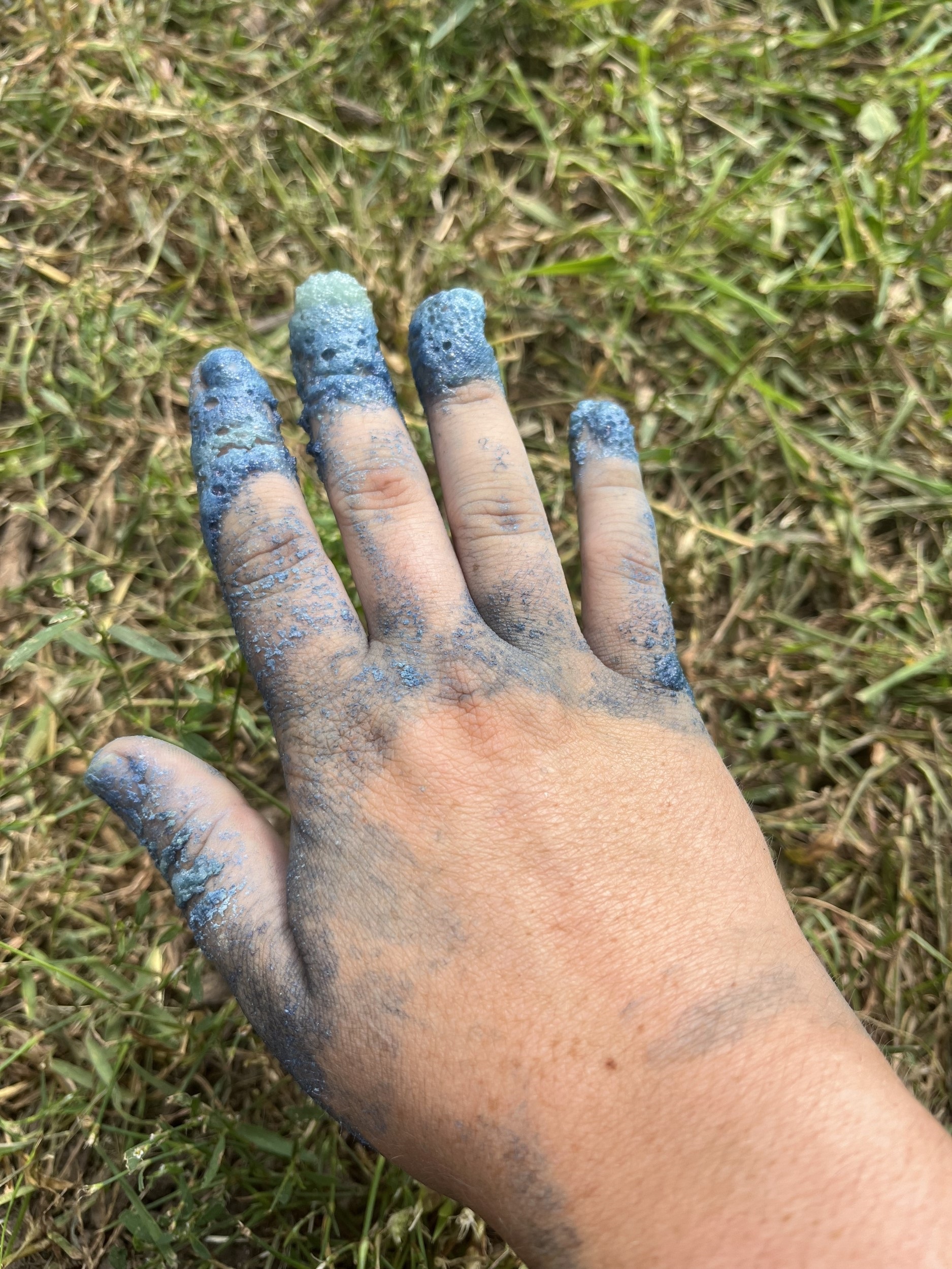 We attempted three different methods to apply these two powders to our skin. First, we applied the powder from the indigo-method directly to our skin. This would have been achievable historically but resulted in very little colour on our skin and the colour that was present was a very muddy blueish green colour. The powder retrieved from the bubbles on the modern vat was a slightly bluer colour but was not notably blue from even one meter away. This powder came from a process that was not directly replicable in the ancient world because Thiourea Dioxide is a modern chemical. However, the Thiourea Dioxide is being used in place of the fermentation process. Similar bubbles could be created through aerating dye vats that were fermented over a longer period, such as with the medieval methods. The effect of these powders on the skin was reminiscent of a minor bruise. Additionally, both powders brushed off very easily. We concluded that applying powdered woad in this manner would not have been visible let alone notable from across a battlefield and it would not have survived anything or anyone touching it.