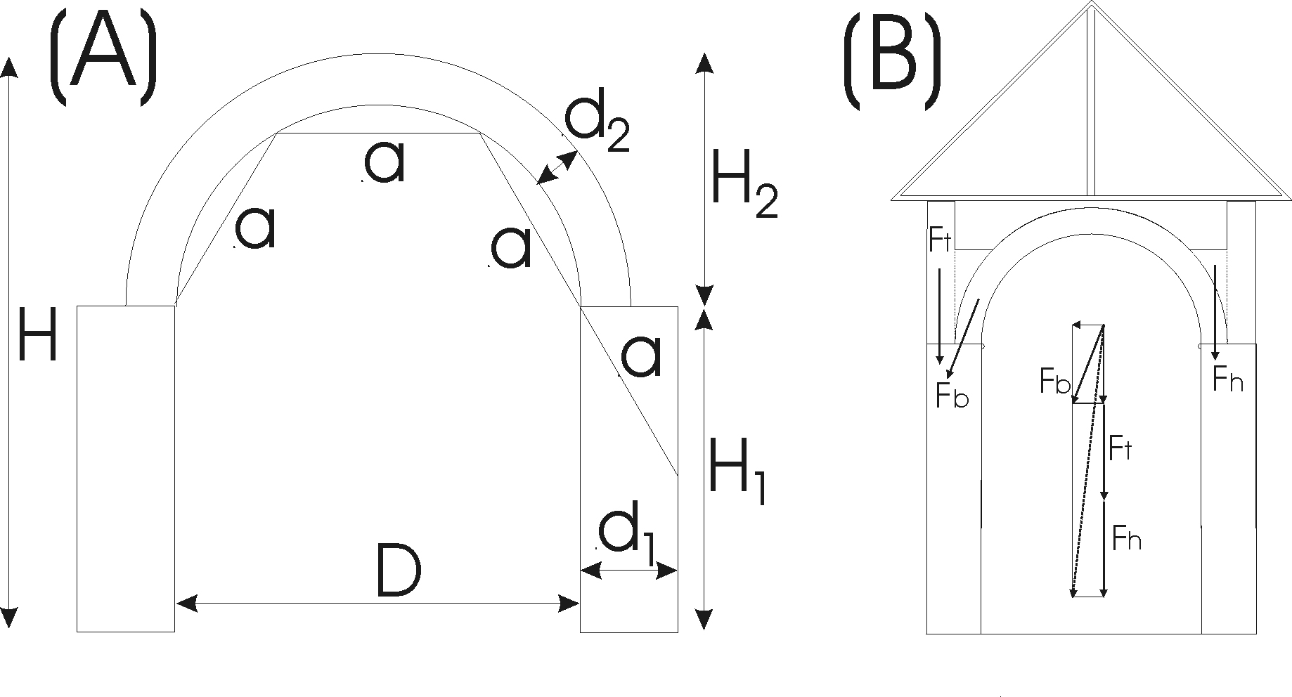A comprehensive, architectural study of antiquity has been compiled by Vitrovius (1964). Its influence was still noticeable in the Middle Ages. The vaulting of the medieval buildings and its static design determined the major dimensions of the building (span, height etcetera). Vitruvius also described vaulted buildings in his book and drew the attention to the fundamental importance of the supports. There are documents from the 15thcentury setting out the rules of their design. These documents summarize the relations between the vaulted roofing and the supporting wall. One of these documents was authored by L.B. Alberti (Nemcsics 2008). These rules are applicable only when the arch over the span is not very large. These rules set the relationship between the span, the height of the construction and the width of the supporting wall. The width of the support must be a quarter of the length of the span. If the height of the construction is increased, the support must become wider. The rule calls for a ratio of four again. The thickness of the vaulting must be at least one tenth of the span (See Figure 2). Later on F. Blondel (Nemcsics 2008) laid down the same rule. These rules apply to bridges over the spans where the height of the support does not exceed the one and a half times the length of the span. The rule, depending on the height of the arch, recommends thinner or wider supporting walls due to the different forces. When the arch is a semi circle then the ratio becomes a quarter, leading to the same result as before. These rules originated in the 15th-16th centuries, and must have been known much earlier, because we find the same or similar rules applied in the buildings of antiquity. We can safely assume therefore, that these rules had been known and applied in the early Middle Ages. These rules, described here, fit the small round church architecture perfectly. In case of the churches of much smaller and much larger diameter, the real numerical values often deviate from the ones calculated from the rule. This indicates a deeper understanding of the design principles and not just the application of the rule of thumb (Bandmann 1949, Mainstone 1977, Cowan 1977, Bütter & Hampe 1977, Baker 1989). The formation of the vaulting also shows refined technical expertise. It is enough to look at the rule of relation of the minimum thickness of the vaulting to the span, or the increased cross section towards the supports, to see the link to the loading of the supports. In two dimensions, in a static construction under pressure, the load line must stay within the cross section for the system to stay stable. The real proof of the design is that these vaulted edifices are standing fast after hundreds of years.