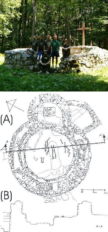 Our knowledge of rotundas is broadening as, every so often, more round churches are discovered during excavations in the Carpathian basin (e.g. Abasár, Nádasd) (Nemcsics 2008). The walls, forming the base of the reconstruction described in this paper, have been recently discovered. The excavations on the hills of Öreg-Kovács, bordering the village of Baj, have been going on for the last ten years. This excavation is located on a forest-covered hill of Gerecse Mountain. During excavations a collection of findings came to light: a church, a cemetery, a mansion, and utility and workshop buildings. The church was identified as the parish church of the village of Kovácsi. That was verified by documentary evidence (Petényi 1992). During Ottoman invasion the village was depopulated and the houses were overgrown by the forest. All knowledge of the place was lost, and its location became unrecognisable. The foundations were covered by rubble and undergrowth. The remains were found by sheer accident. In the course of the excavations not only the stone built foundation was discovered but also hewn stones, graves and other various objects. There was an addition on the south side of the building, which was likely an ossuary. The excavation of the foundation stones made it obvious that the ossuary was not part of the original building but a later addition. Its wall was not jointed to the wall of the main building and its foundation is shallower than that of the church. Clearance of the rubble revealed an original fresco on the wall of the chancel and, in other places, small and larger fresco fragments became visible. Around the church there were more than two hundred graves. Scattered around the walls of the church there were some finely hewn stones mixed with rough pieces. The high of the surviving walling varied between 80 and 120 cm (See Figure 3). The stones of the wall were of limestone, quarried in the nearby quarry.